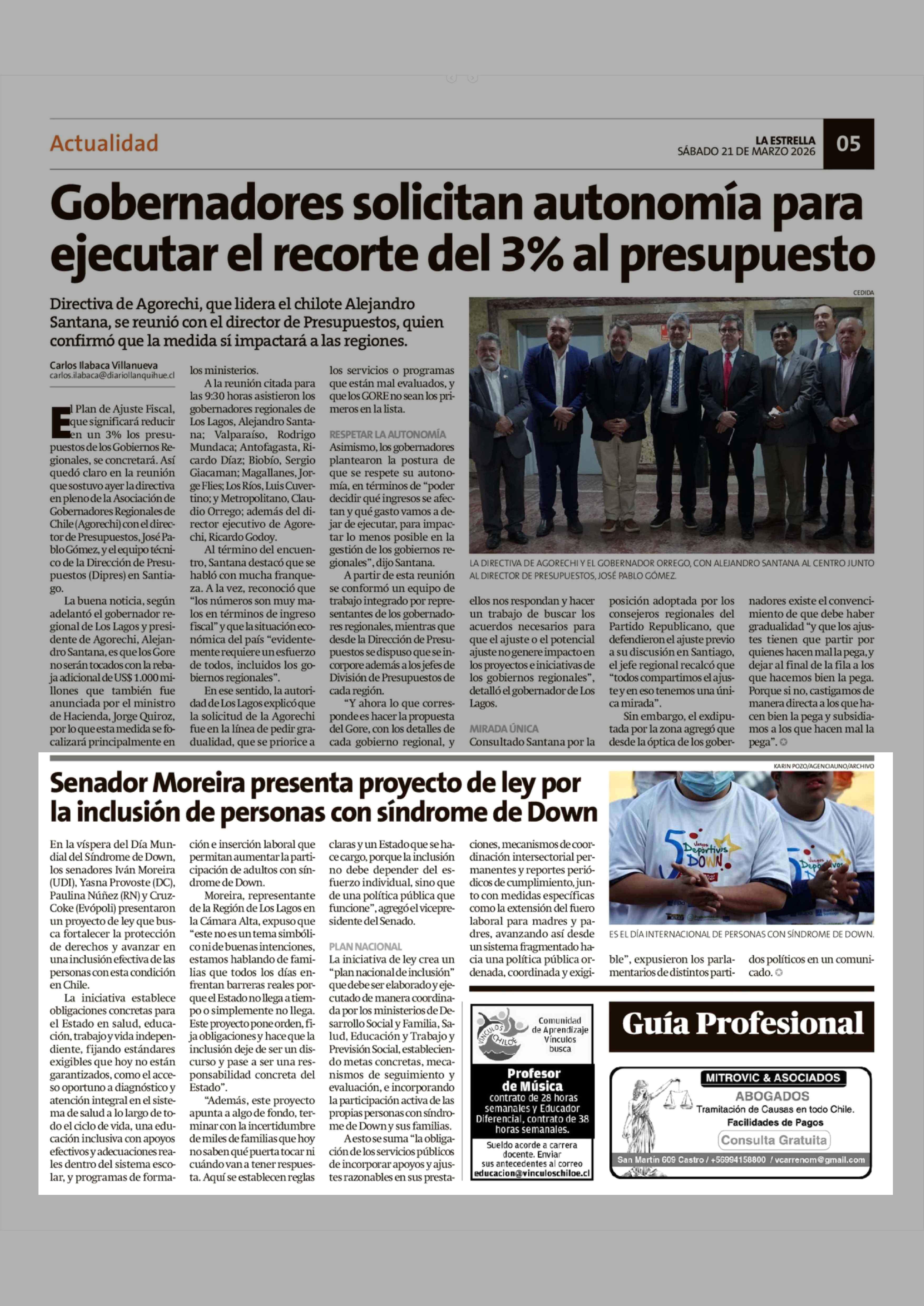 Senador Moreira presenta proyecto de ley por la inclusión de personas con síndrome de Down 21-03-2026 La Estrella de Chiloé |