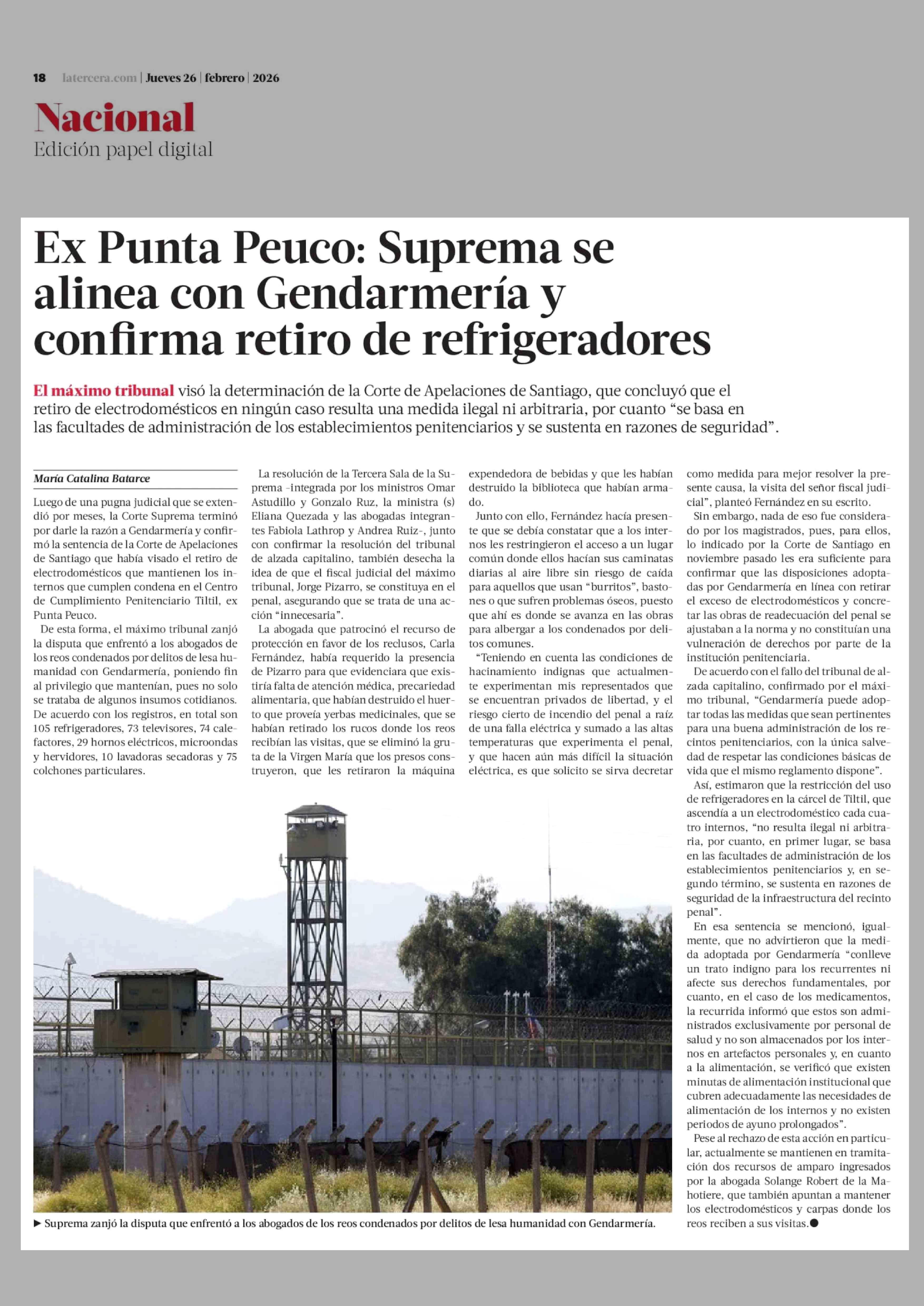 Ex Punta Peuco: Suprema se alinea con Gendarmería y confirma retiro de refrigeradores 26-02-2026 La Tercera |