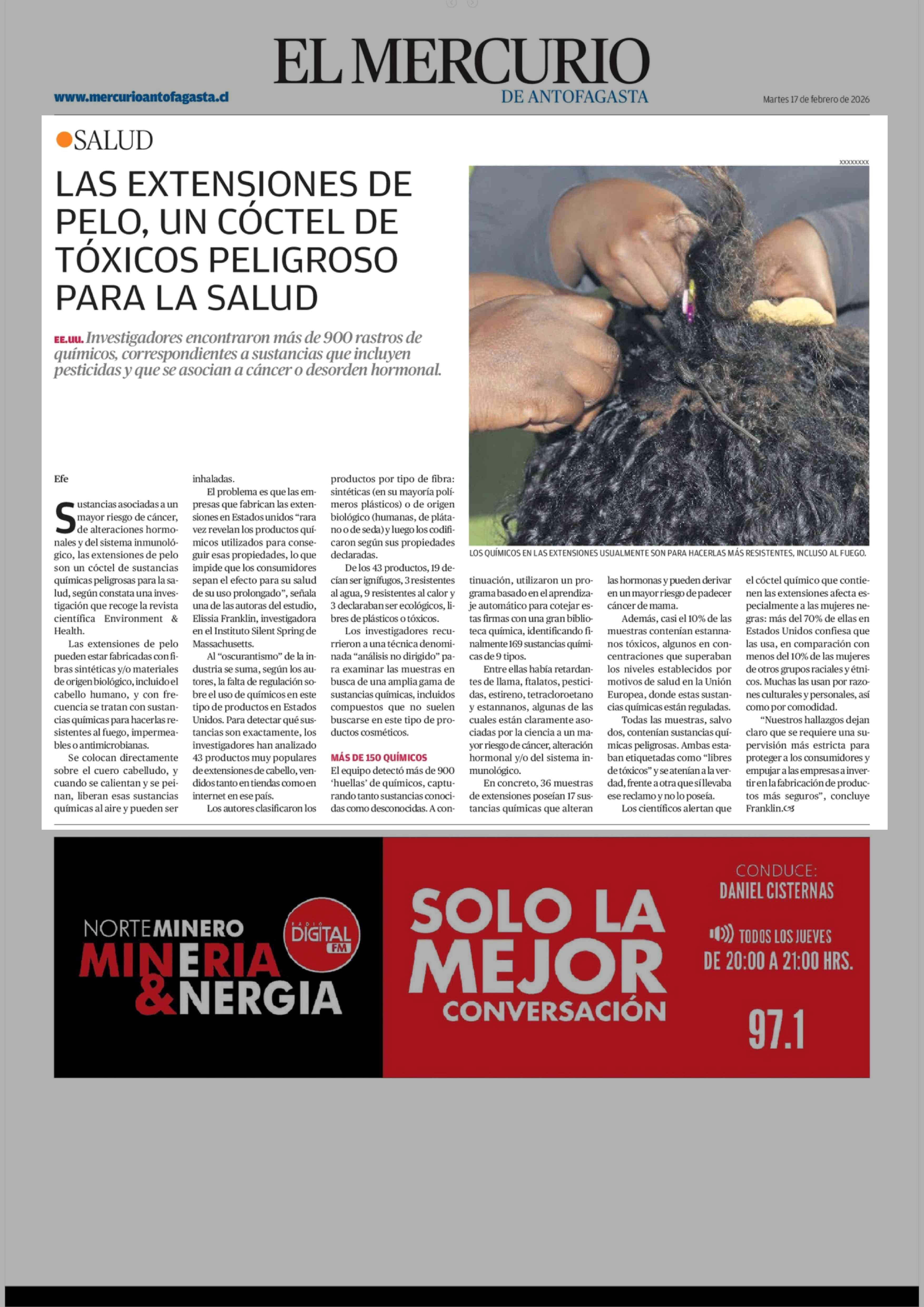 LAS EXTENSIONES DE PELO, UN CÓCTEL DE TÓXICOS PELIGROSO PARA LA SALUD 17-02-2026 El Mercurio de Antofagasta |
