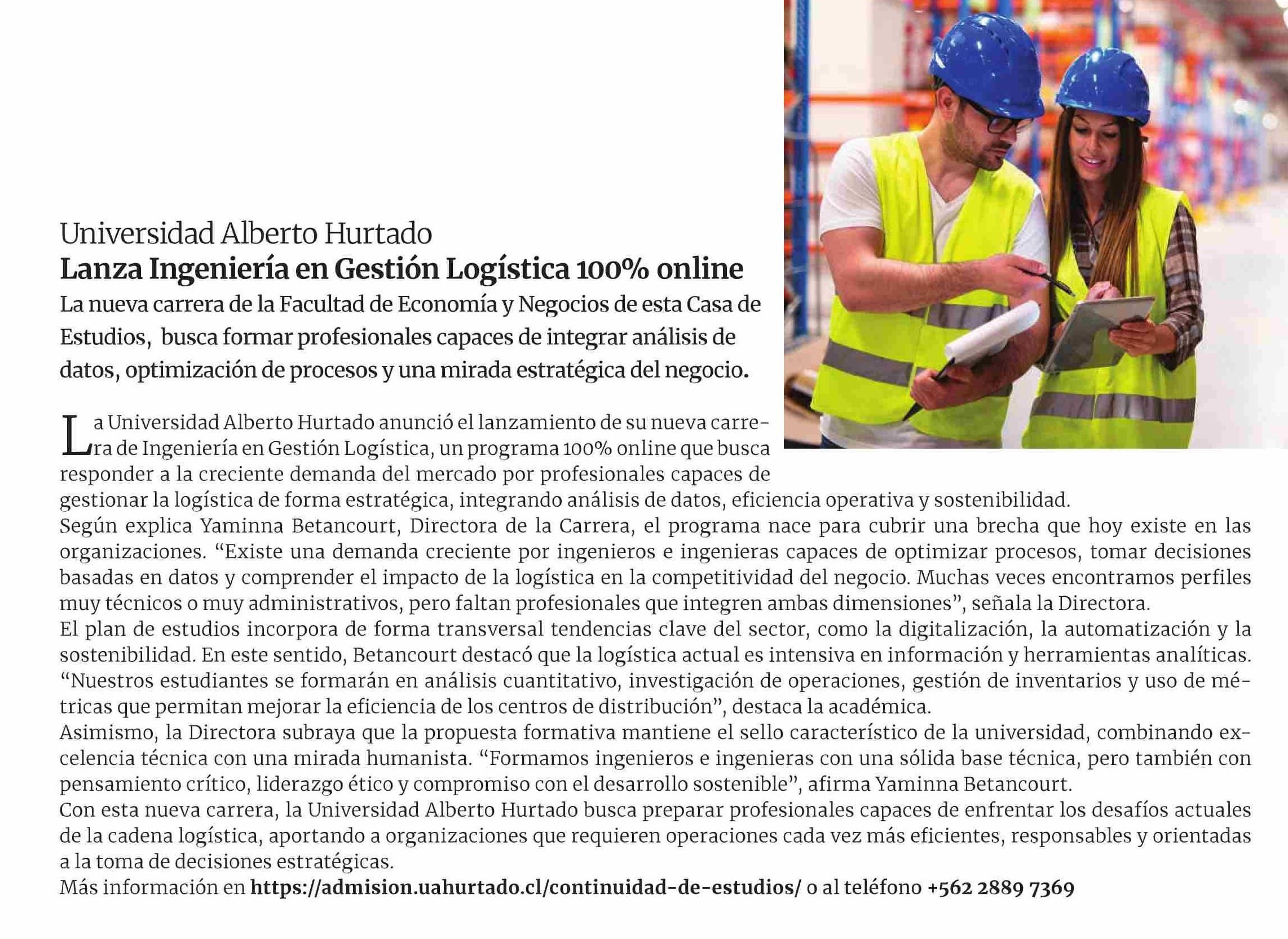 Universidad Alberto Hurtado Lanza Ingeniería en Gestión Logística online 24-03-2026 Revista NG |