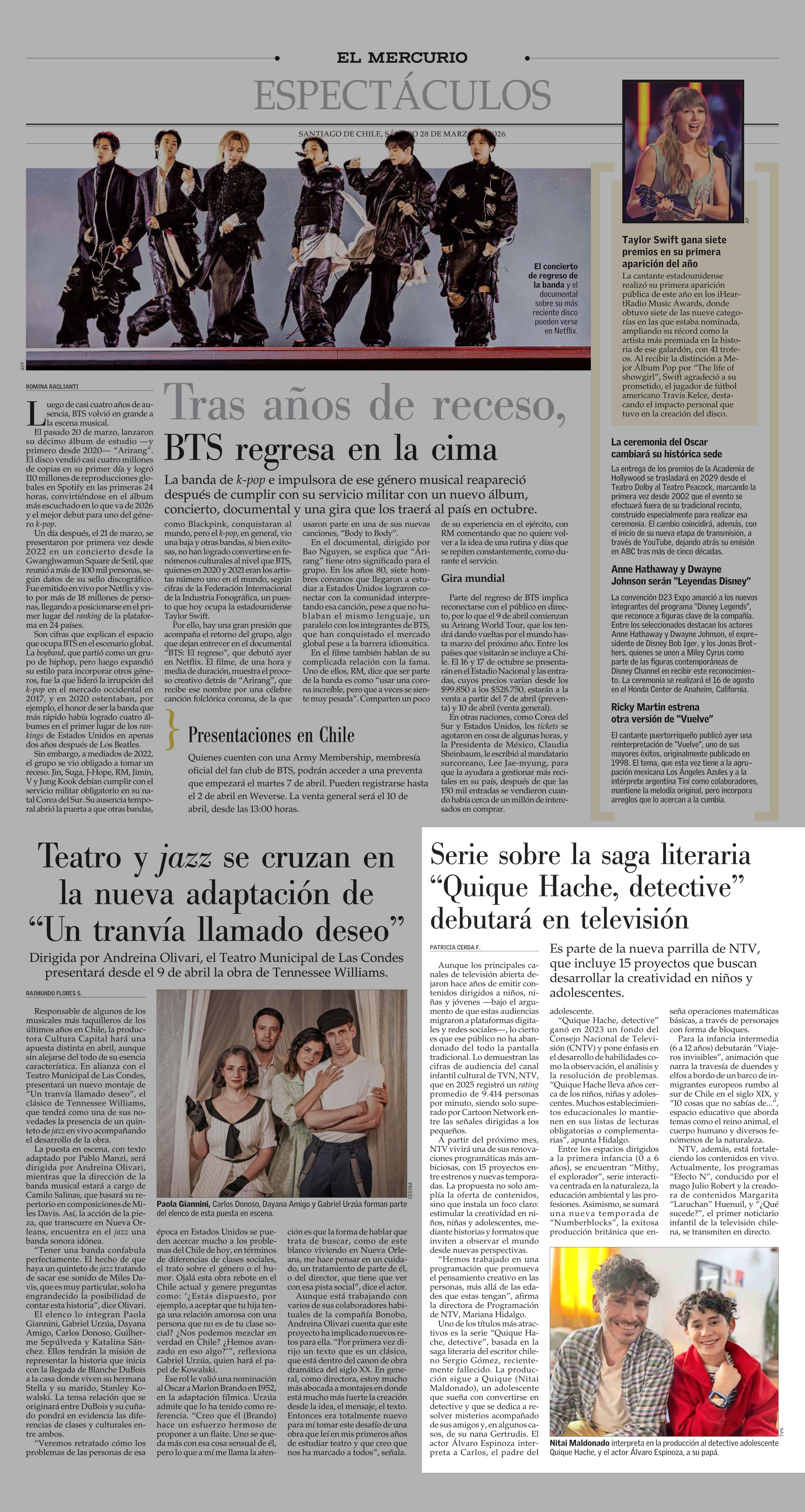 Serie sobre la saga literaria "Quique Hache, detective" debutará en televisión 28-03-2026 El Mercurio |