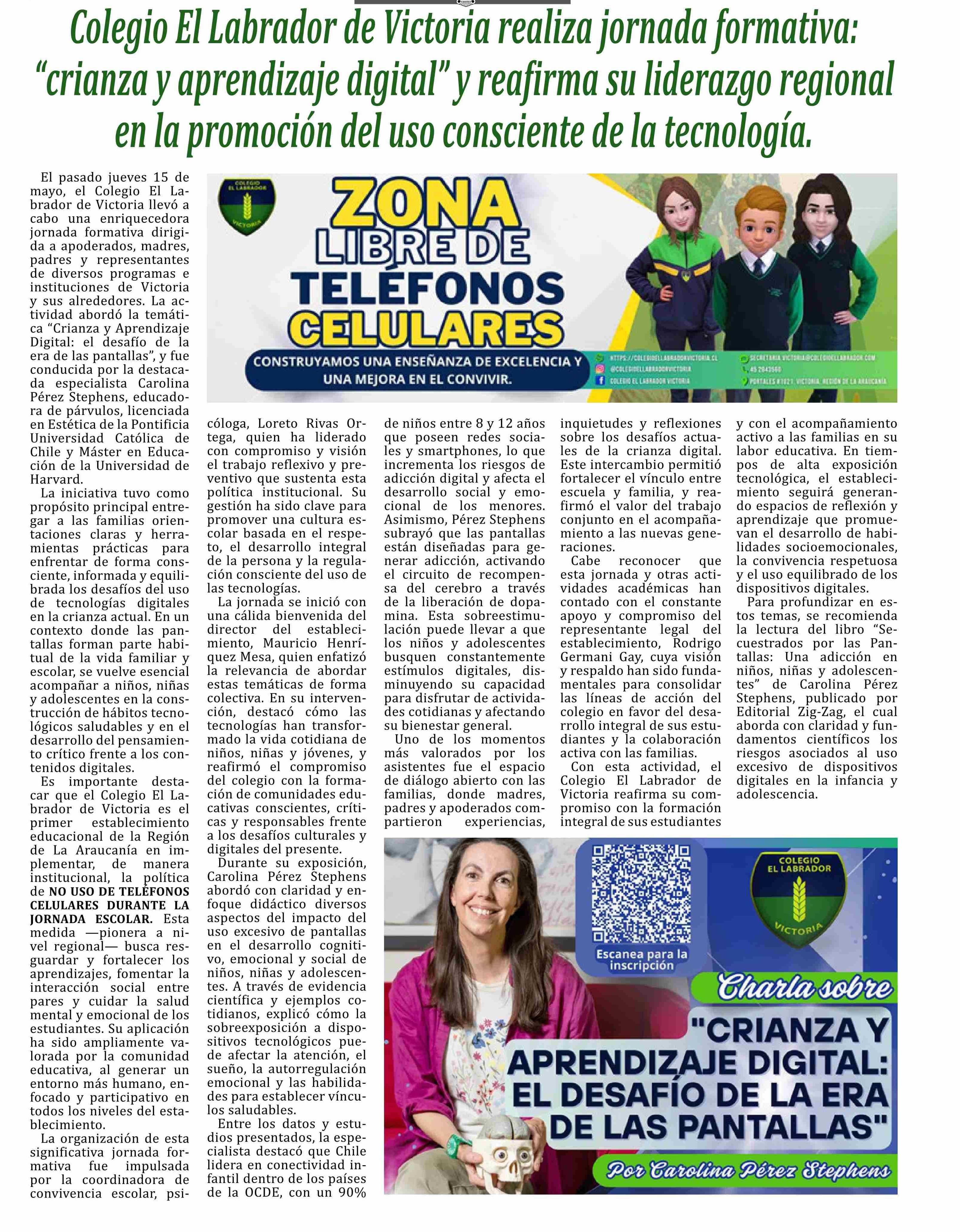 | Título: | Colegio El Labrador de Victoria realiza jornada formativa: “crianza y aprendizaje digital” y reafirma su liderazgo regional en la promoción del uso consciente de la tecnología. |