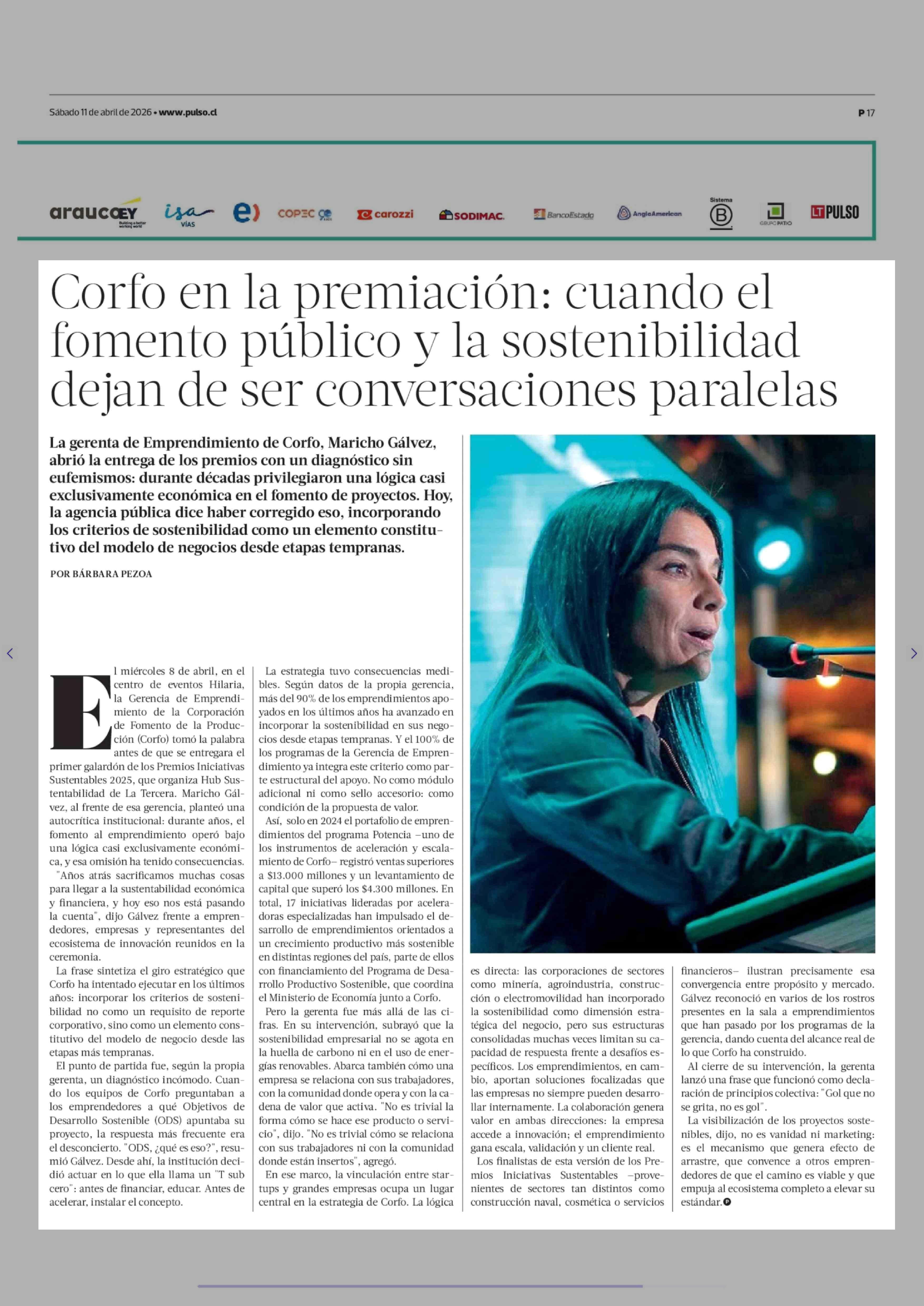 Corfo en la premiación: cuando el fomento público y la sostenibilidad dejan de ser conversaciones paralelas 11-04-2026 La Tercera |