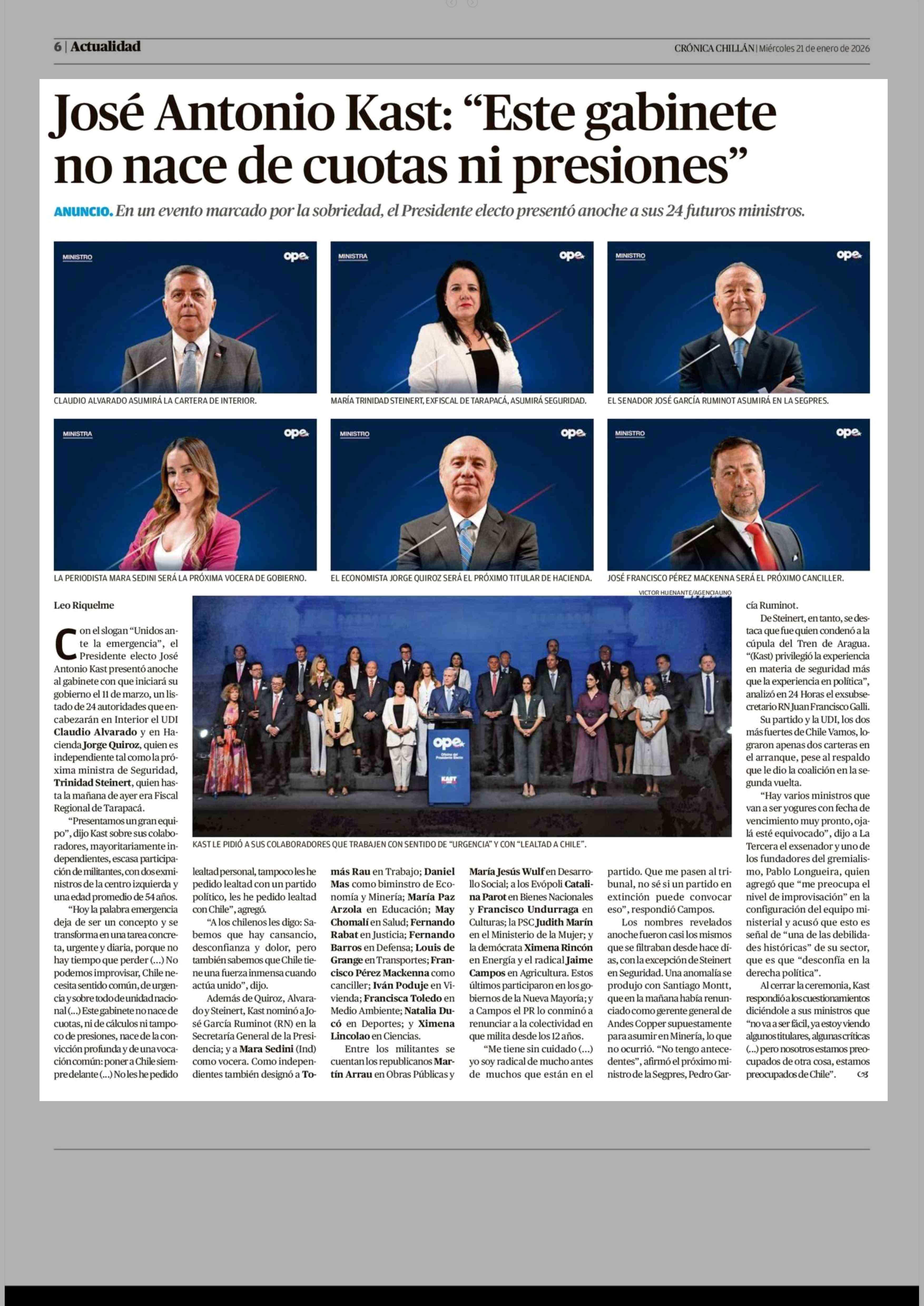 José Antonio Kast: "Este gabinete no nace de cuotas ni presiones" 21-01-2026 Crónica de Chillán |