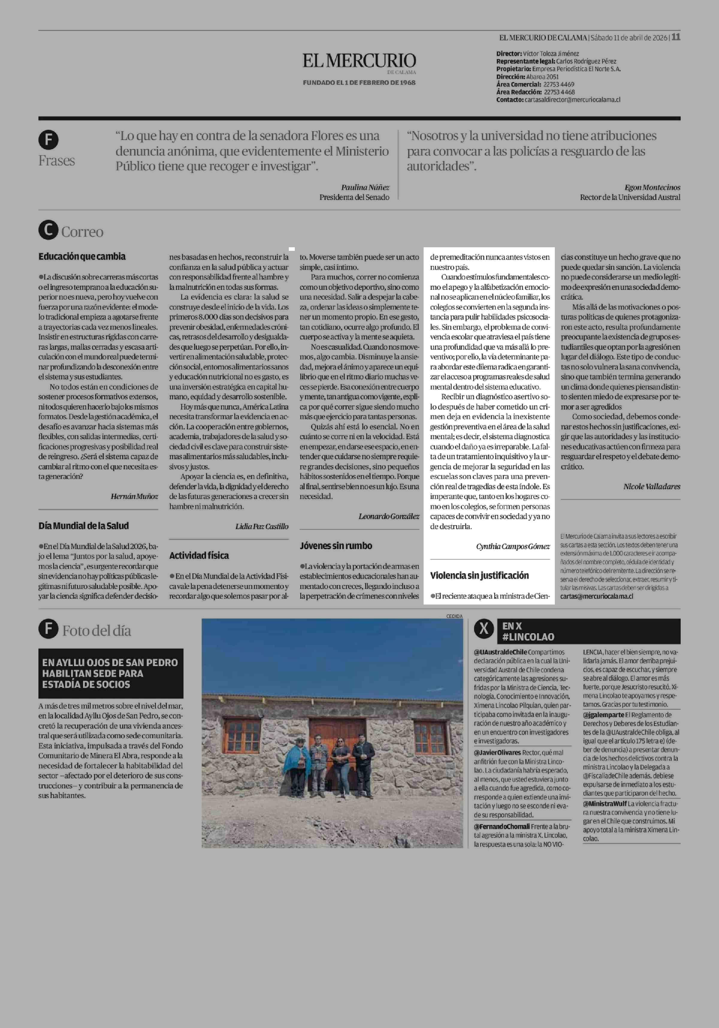 CARTAS: Jóvenes sin rumbo 11-04-2026 El Mercurio de Calama |
