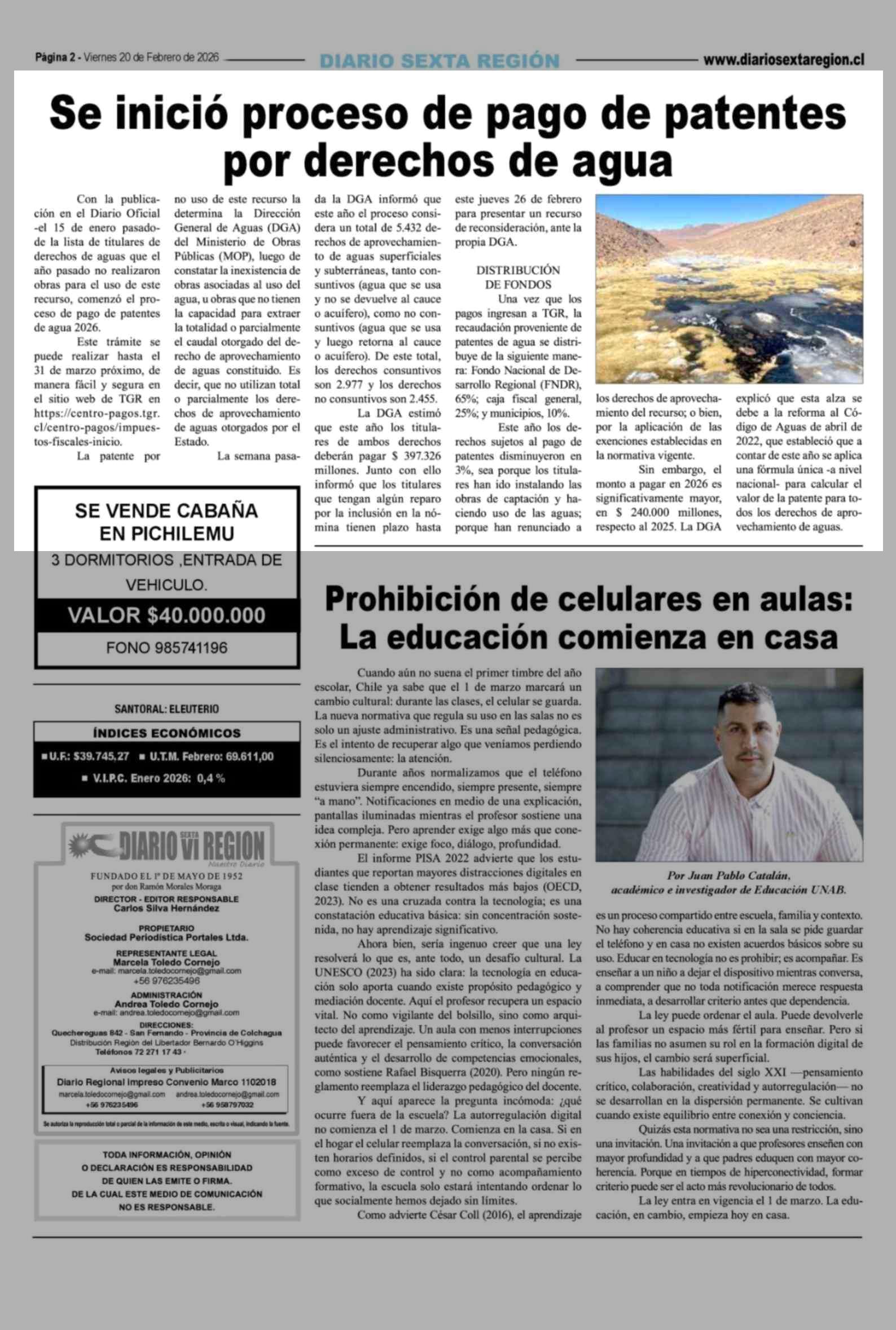 Se inició proceso de pago de patentes por derechos de agua 20-02-2026 Diario VI Región |