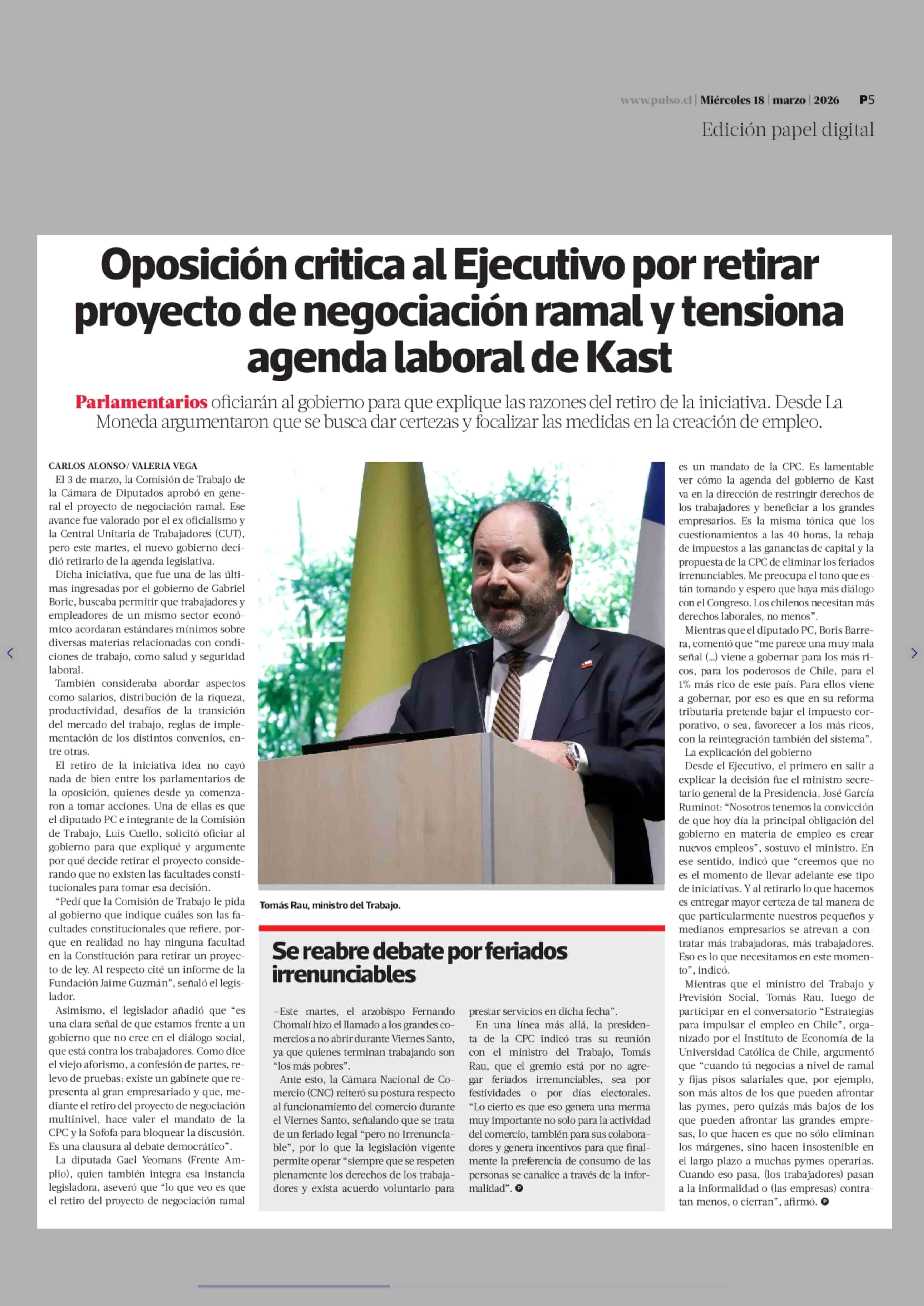Oposición critica al Ejecutivo por retirar proyecto de negociación ramal y tensiona agenda laboral de Kast 18-03-2026 La Tercera |