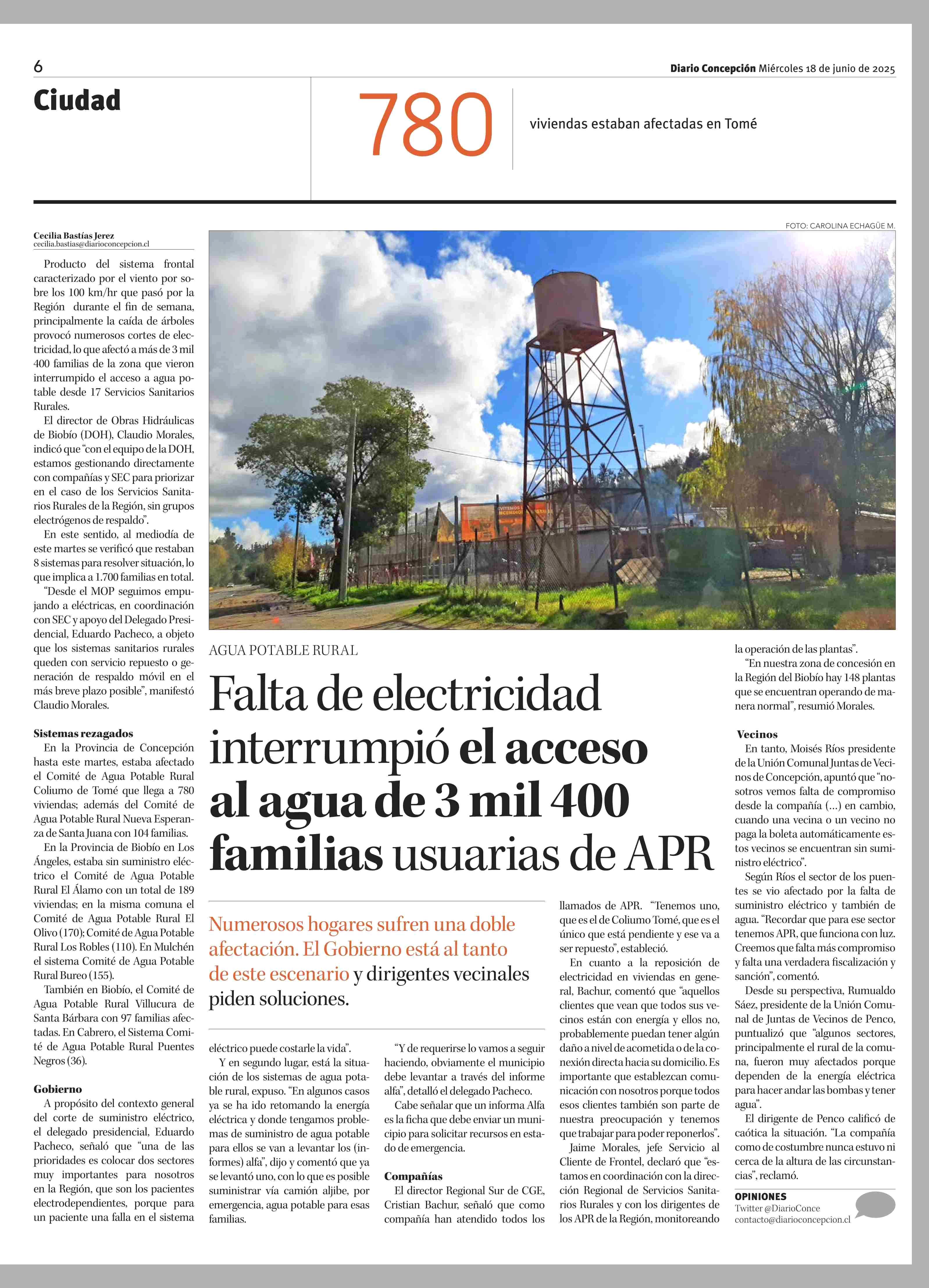 Falta de electricidad interrumpió el acceso al agua de 3 mil 400 familias usuarias de APR 18-06-2025 Diario Concepción |