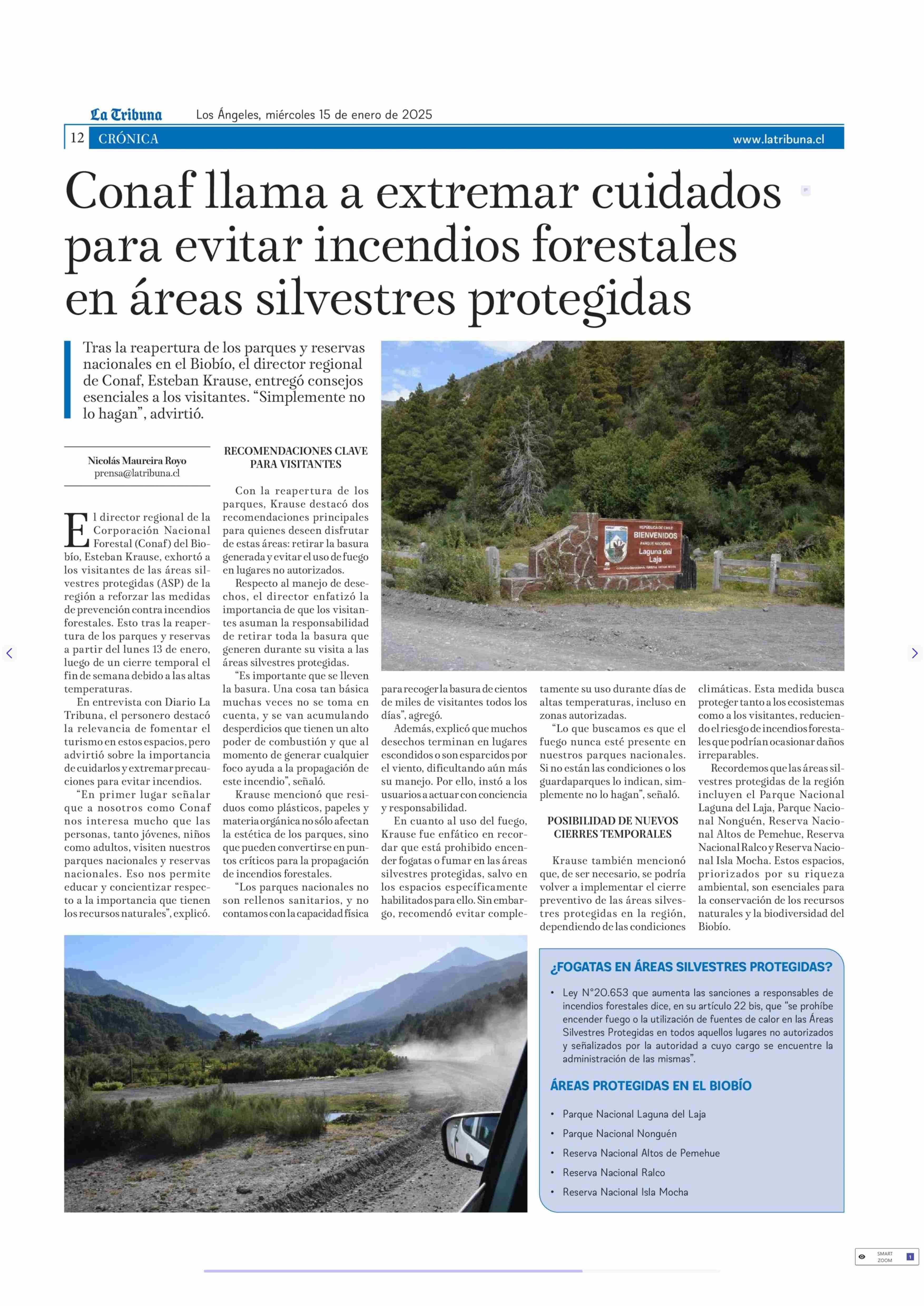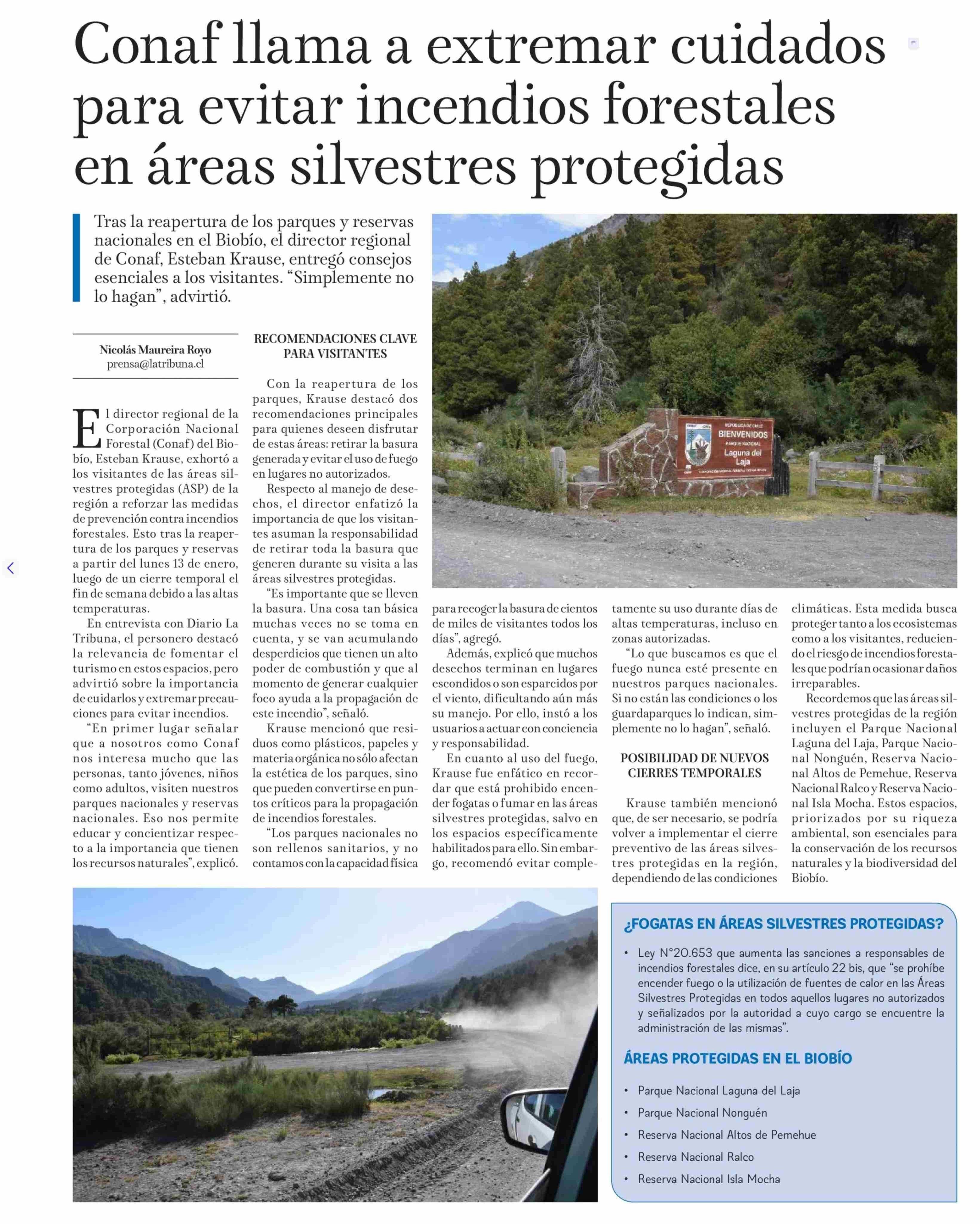 Conaf llama a extremar cuidados para evitar incendios forestales en áreas silvestres protegidas 15-01-2025 La Tribuna |