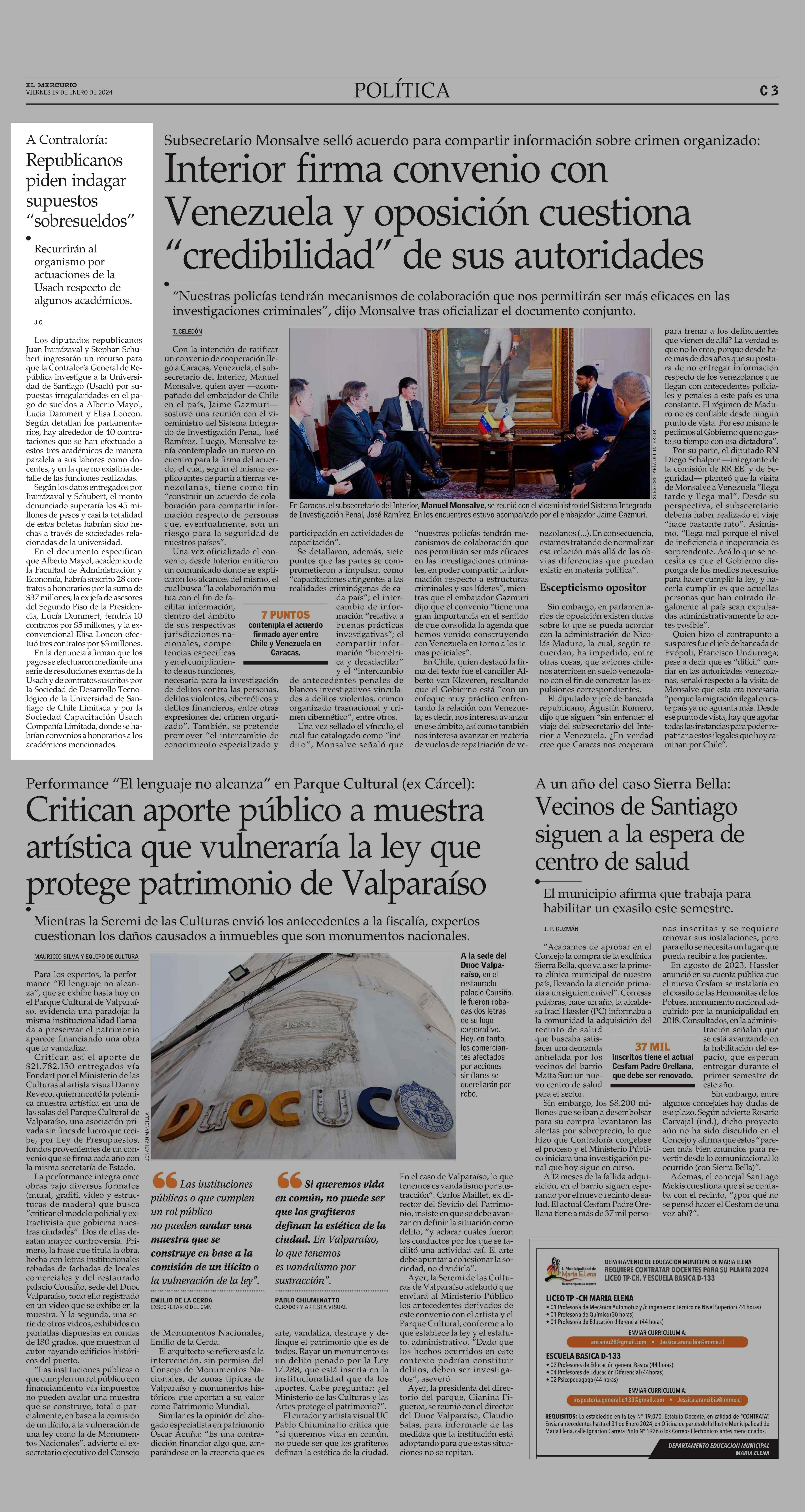 Republicanos piden indagar supuestos "sobresueldos" 19-01-2024 El Mercurio |