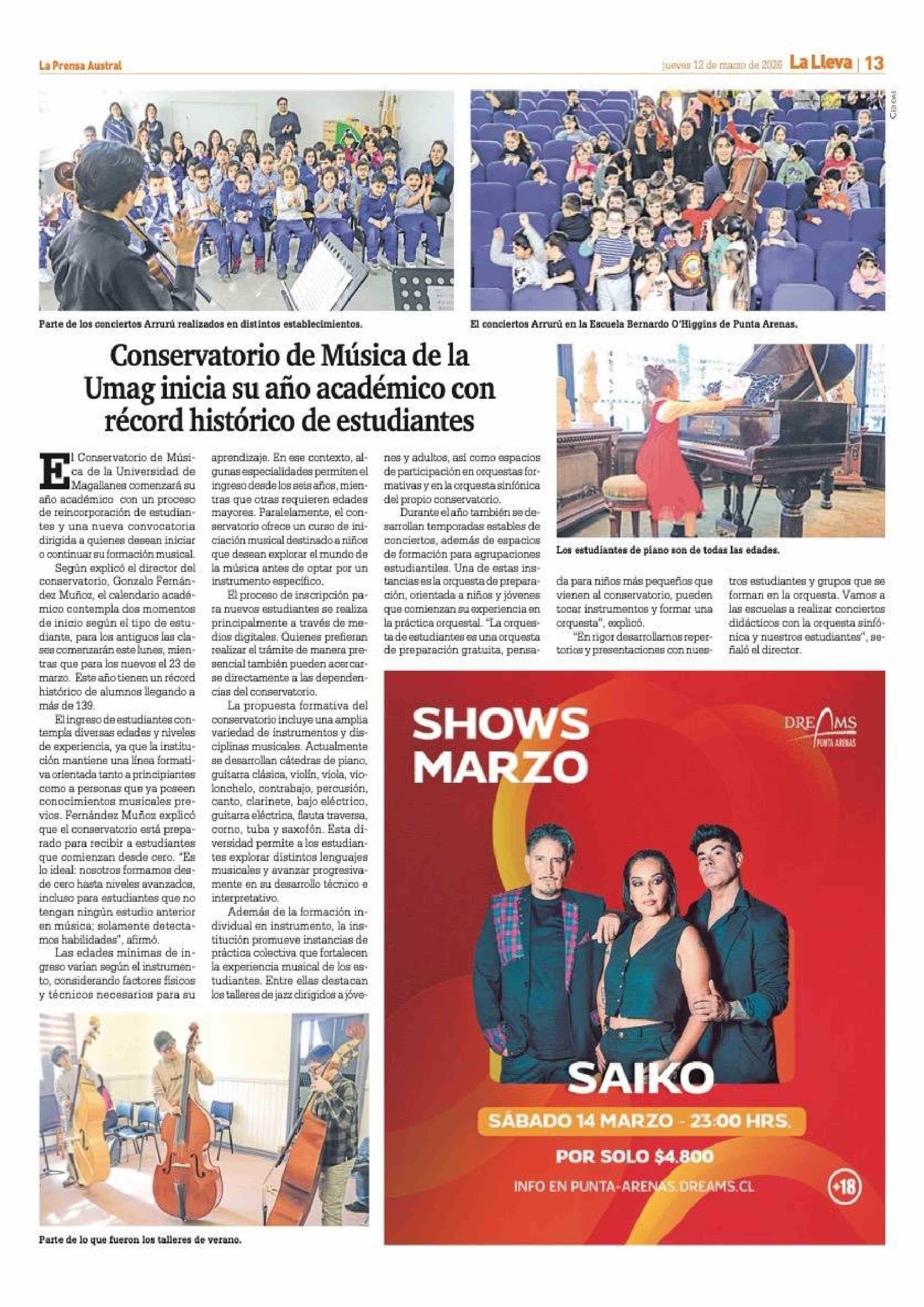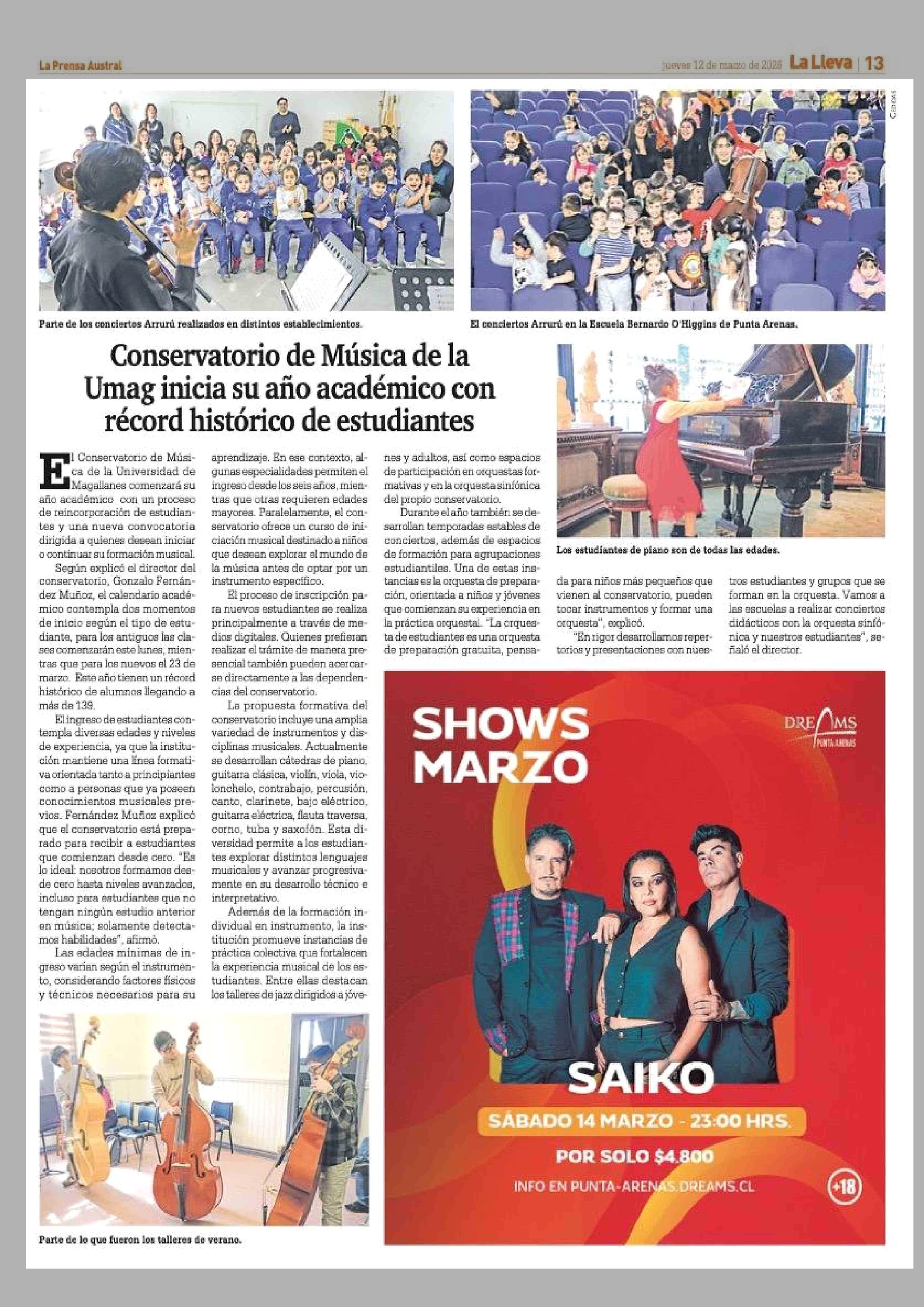 Conservatorio de Música de la Umag inicia su año académico con récord histórico de estudiantes 12-03-2026 La Prensa Austral |