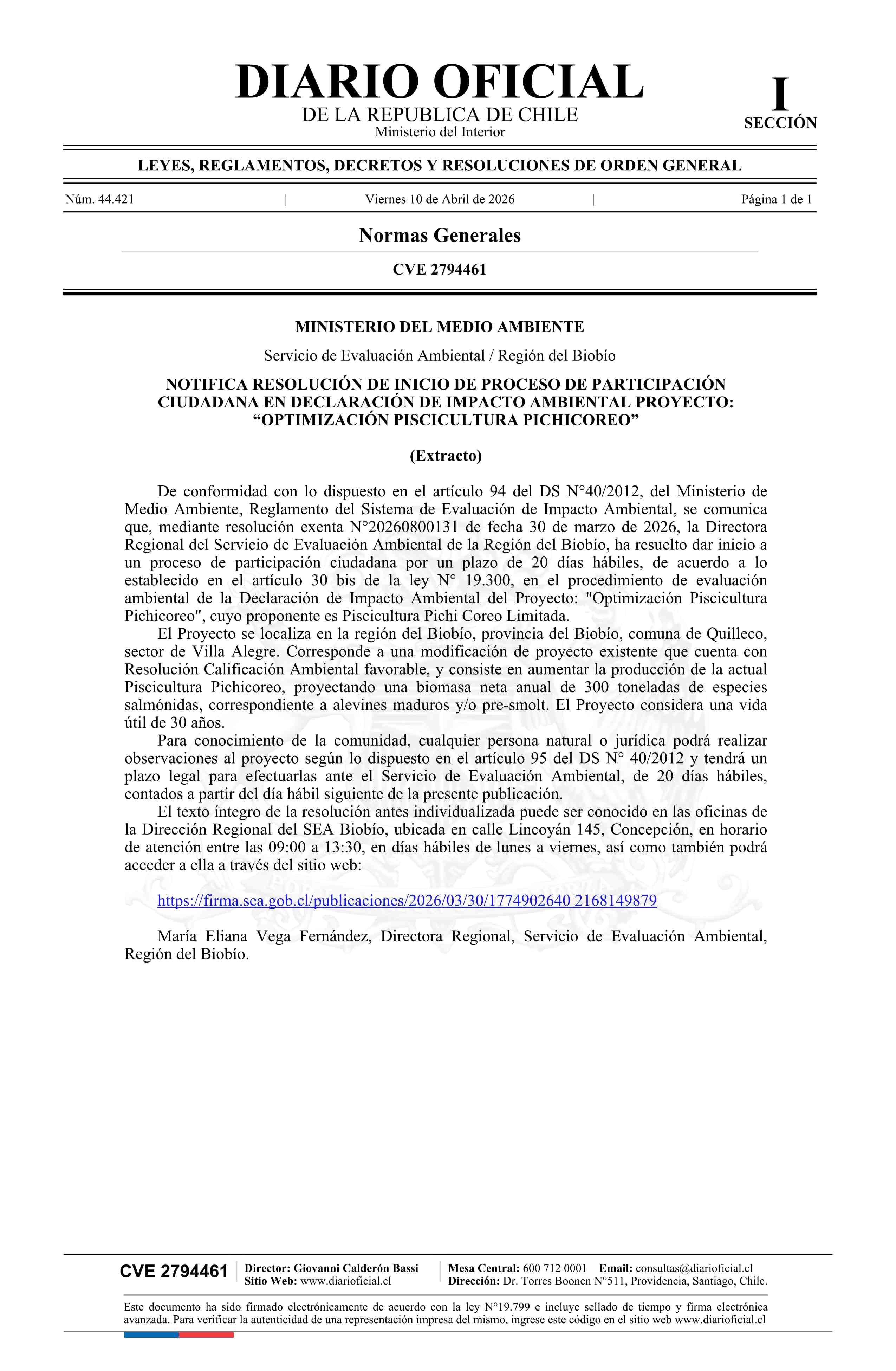 | Título: | Extracto de resolución exenta número 20260800131, de 2026.- Inicia proceso de participación ciudadana en Declaración de Impacto Ambiental del proyecto Optimización Piscicultura Pichicoreo |