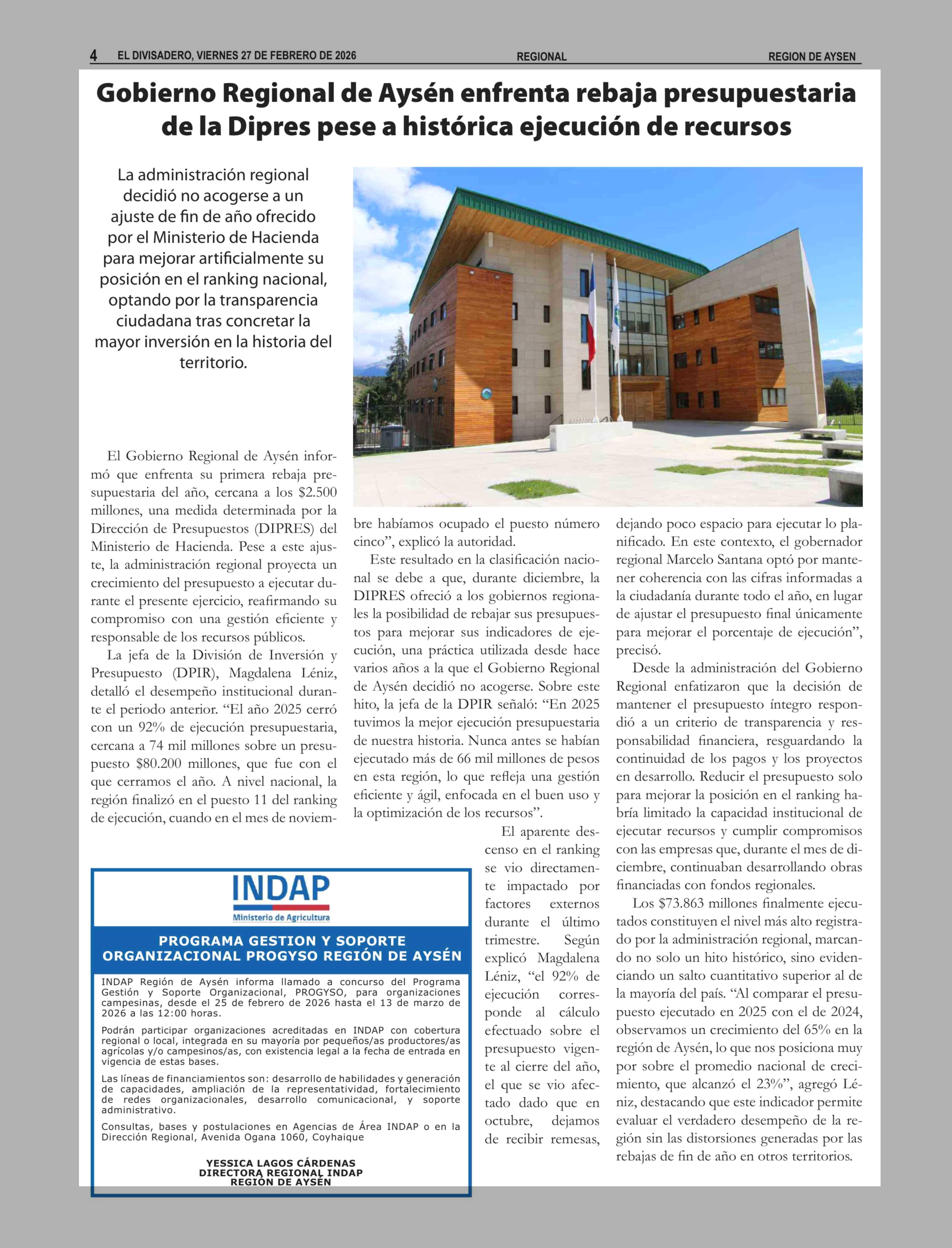 Gobierno Regional de Aysén enfrenta rebaja presupuestaria de la Dipres pese a histórica ejecución de recursos 27-02-2026 El Divisadero |