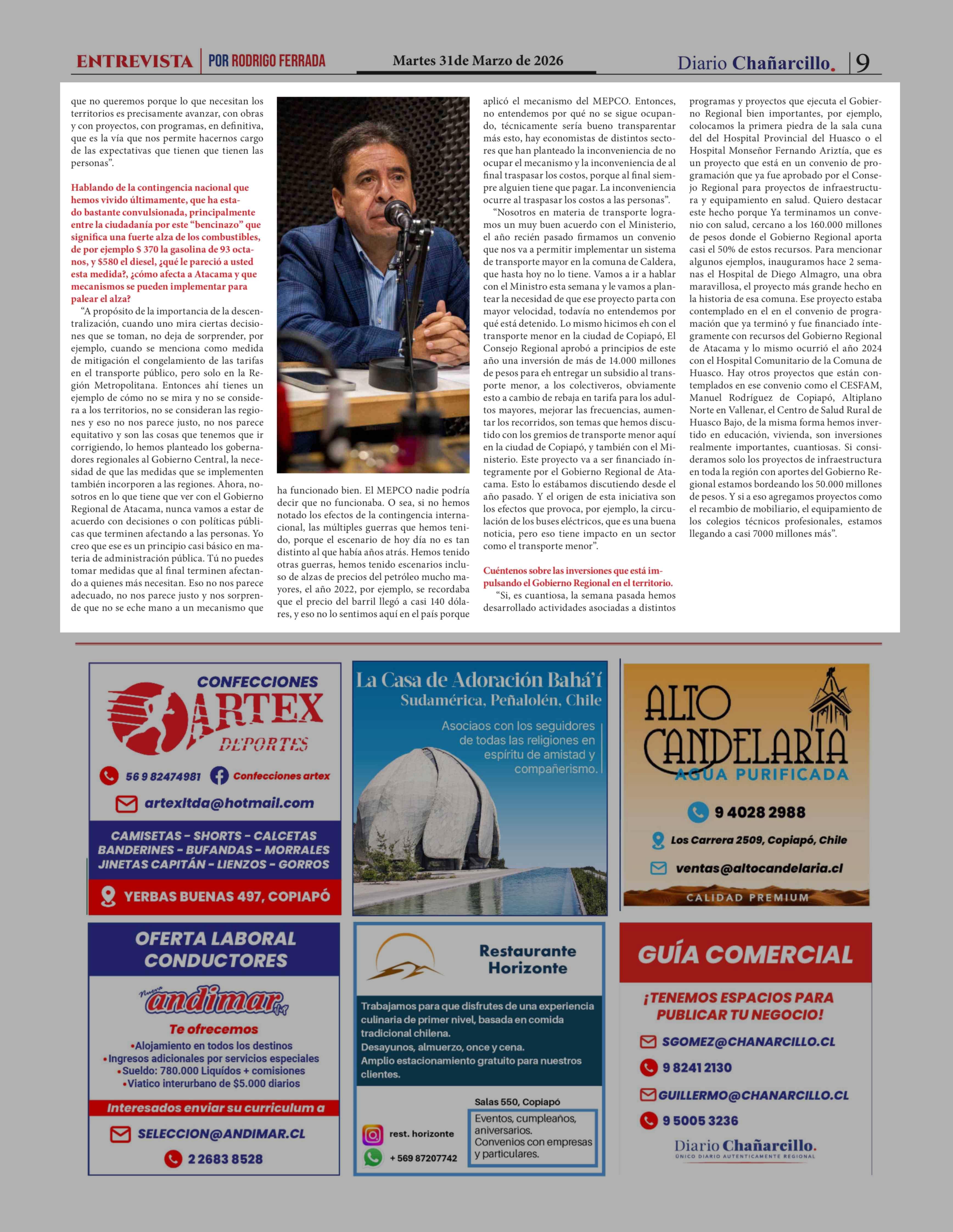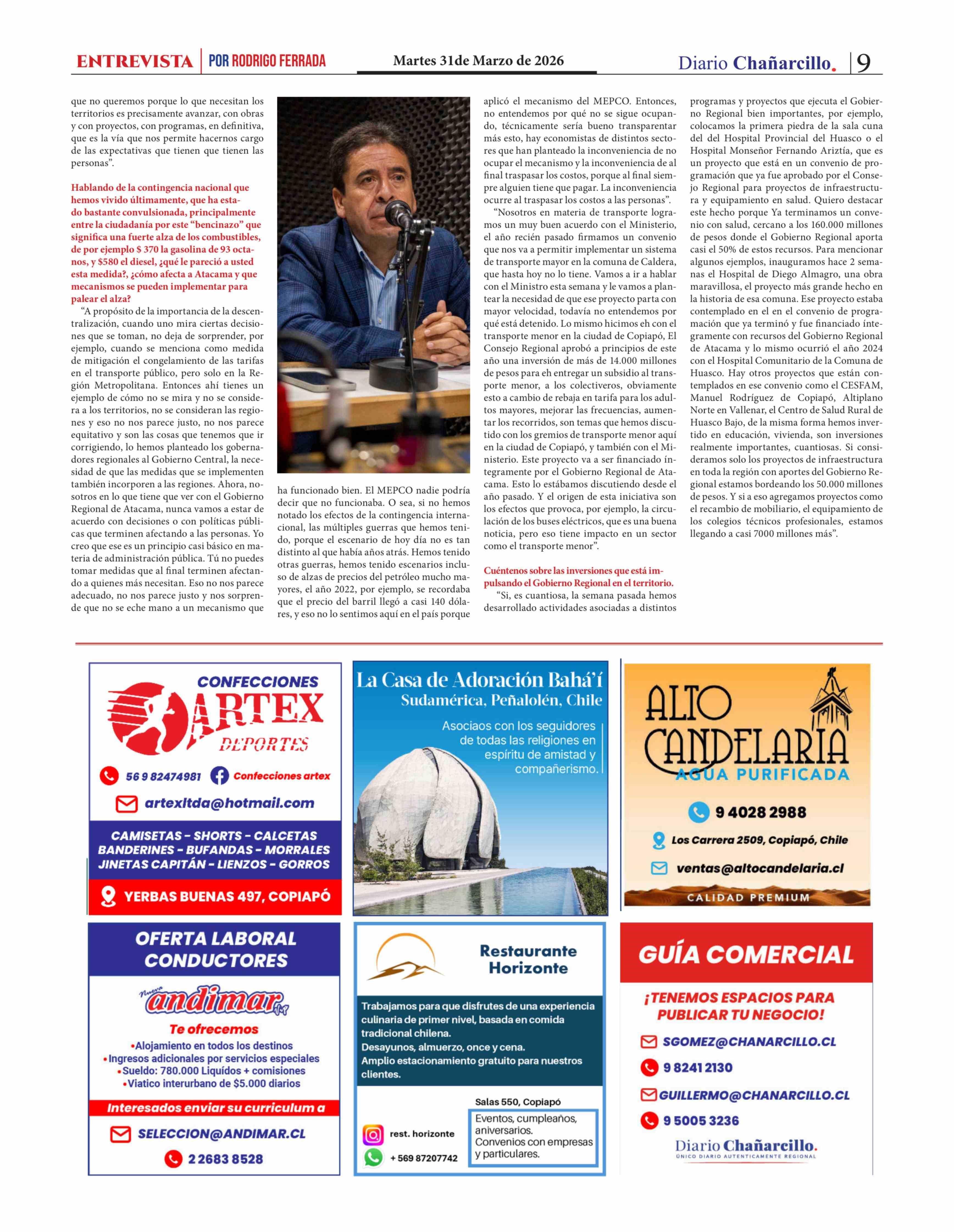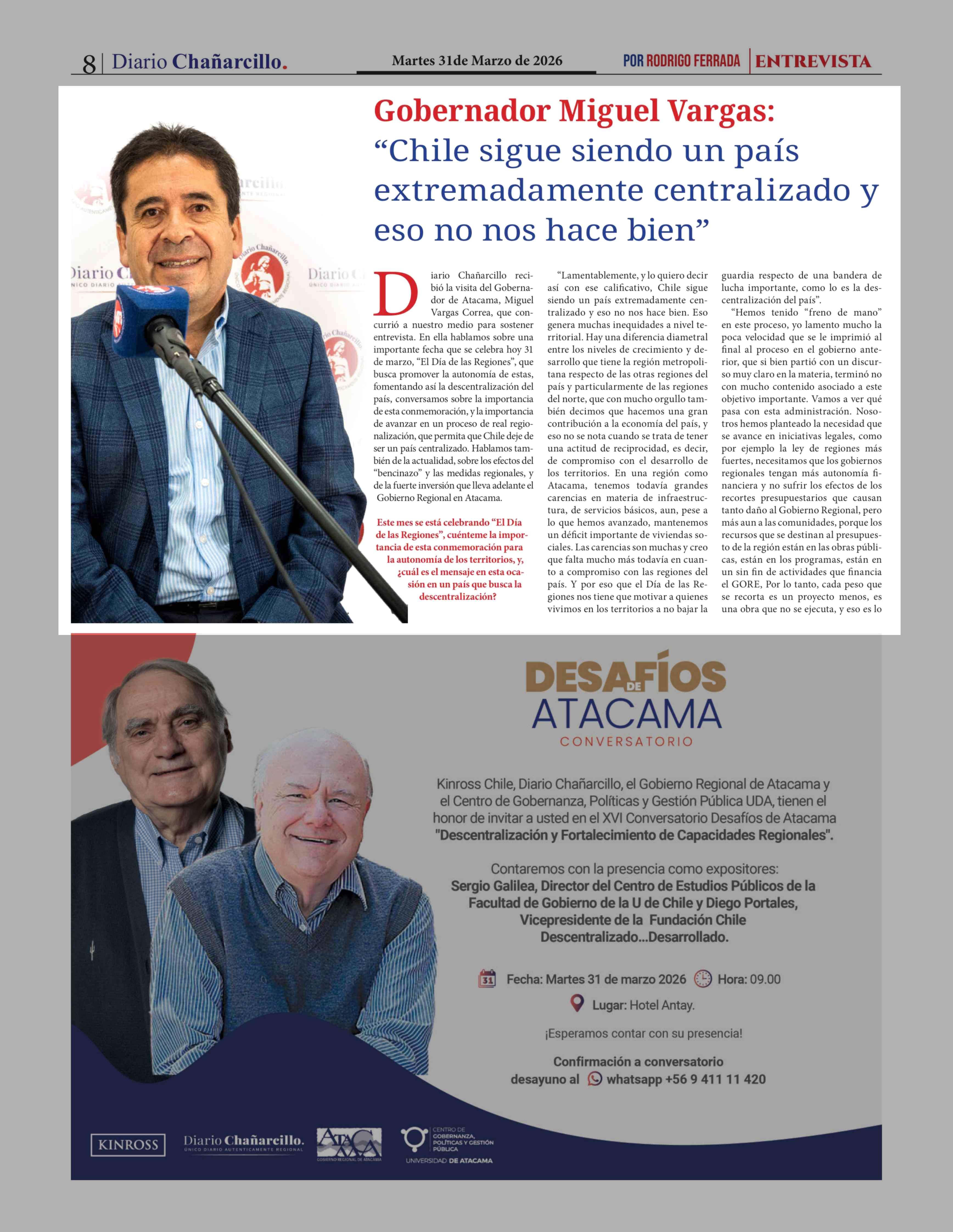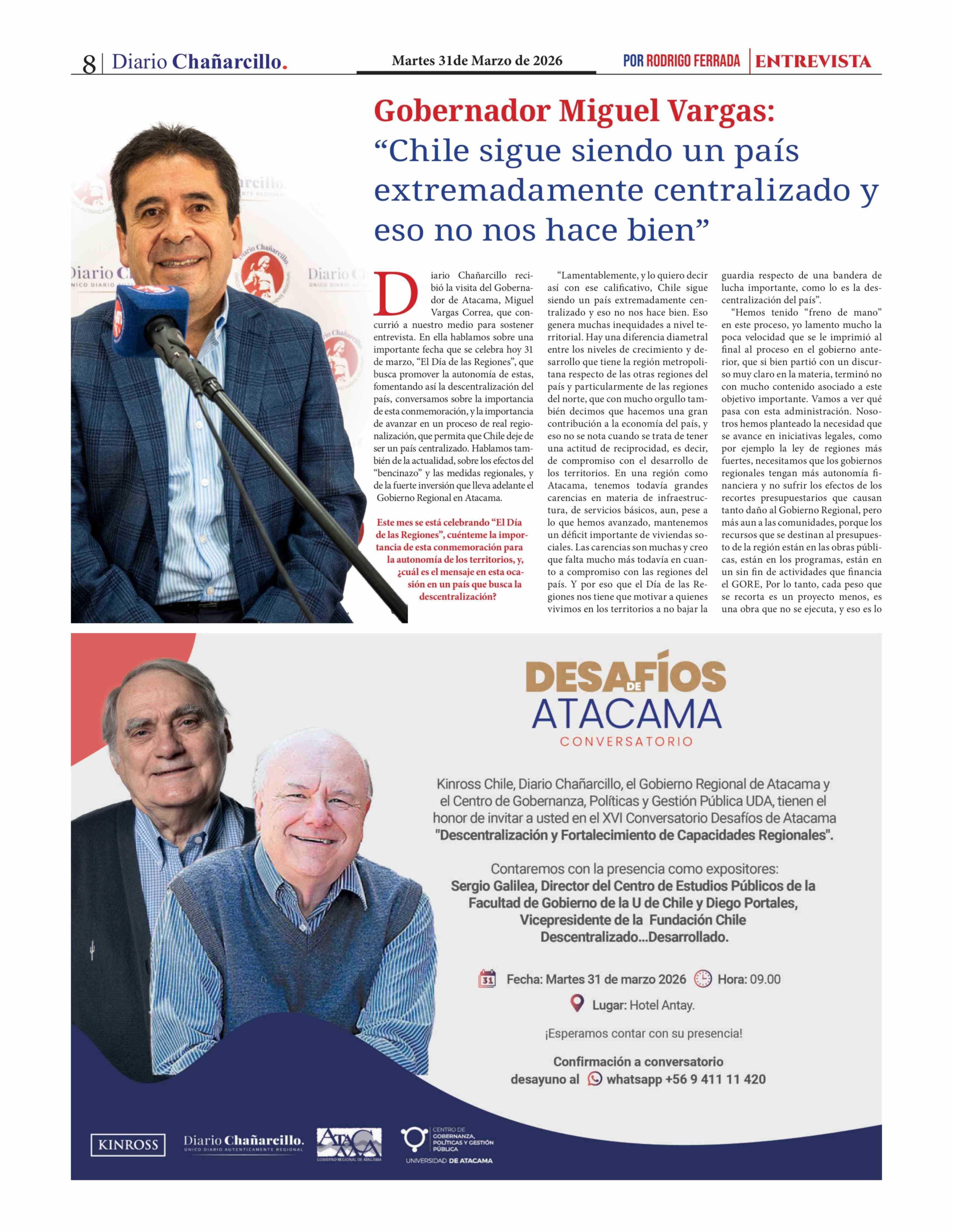Gobernador Miguel Vargas: "Chile sigue siendo un país extremadamente centralizado y eso no nos hace bien" 31-03-2026 Diario Chañarcillo |