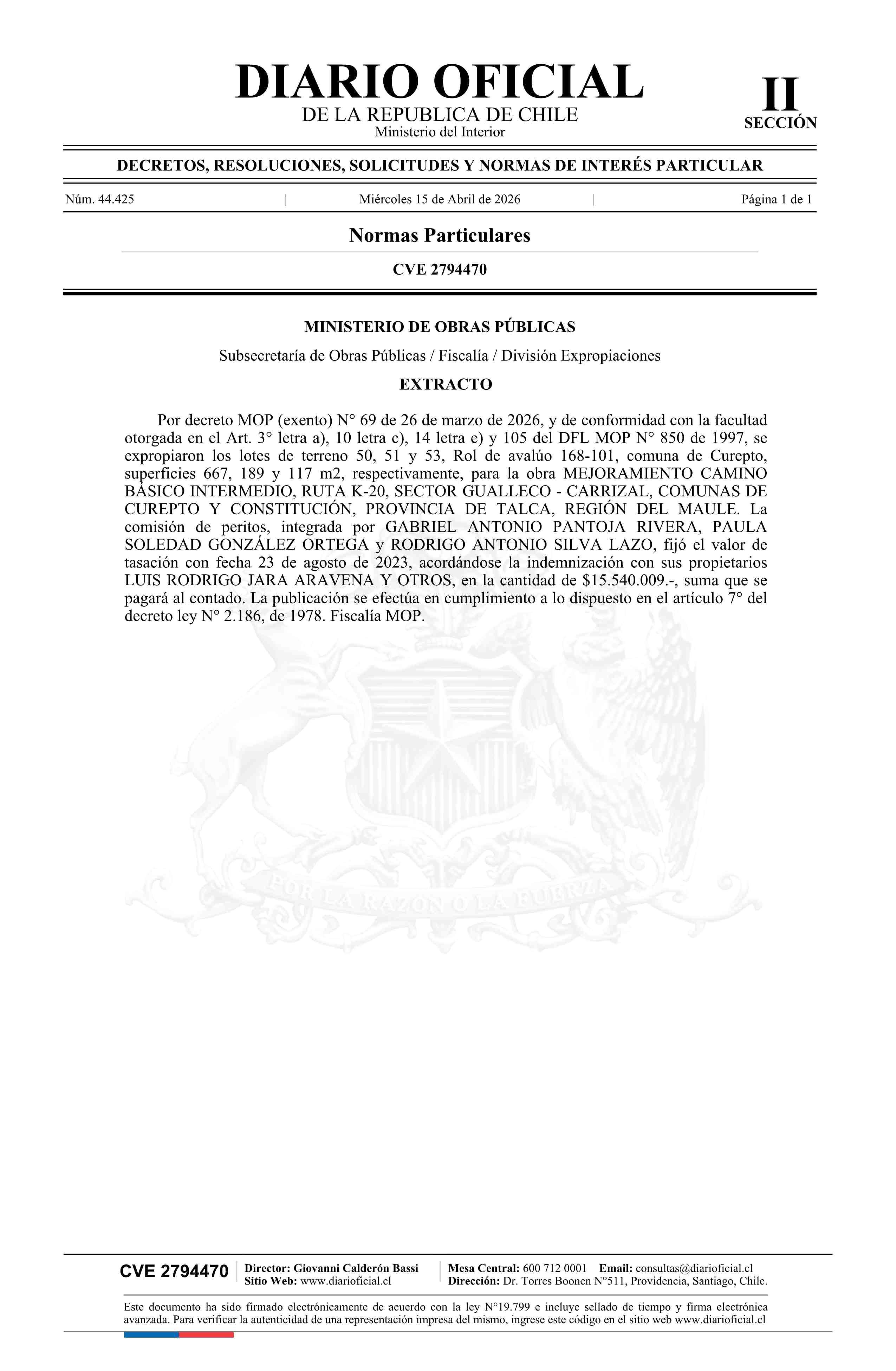 | Fuente: | Diario Oficial Edición Electrónica (Diario Oficial de Chile - 2 Normas Particulares) | Página(s): | 115 |