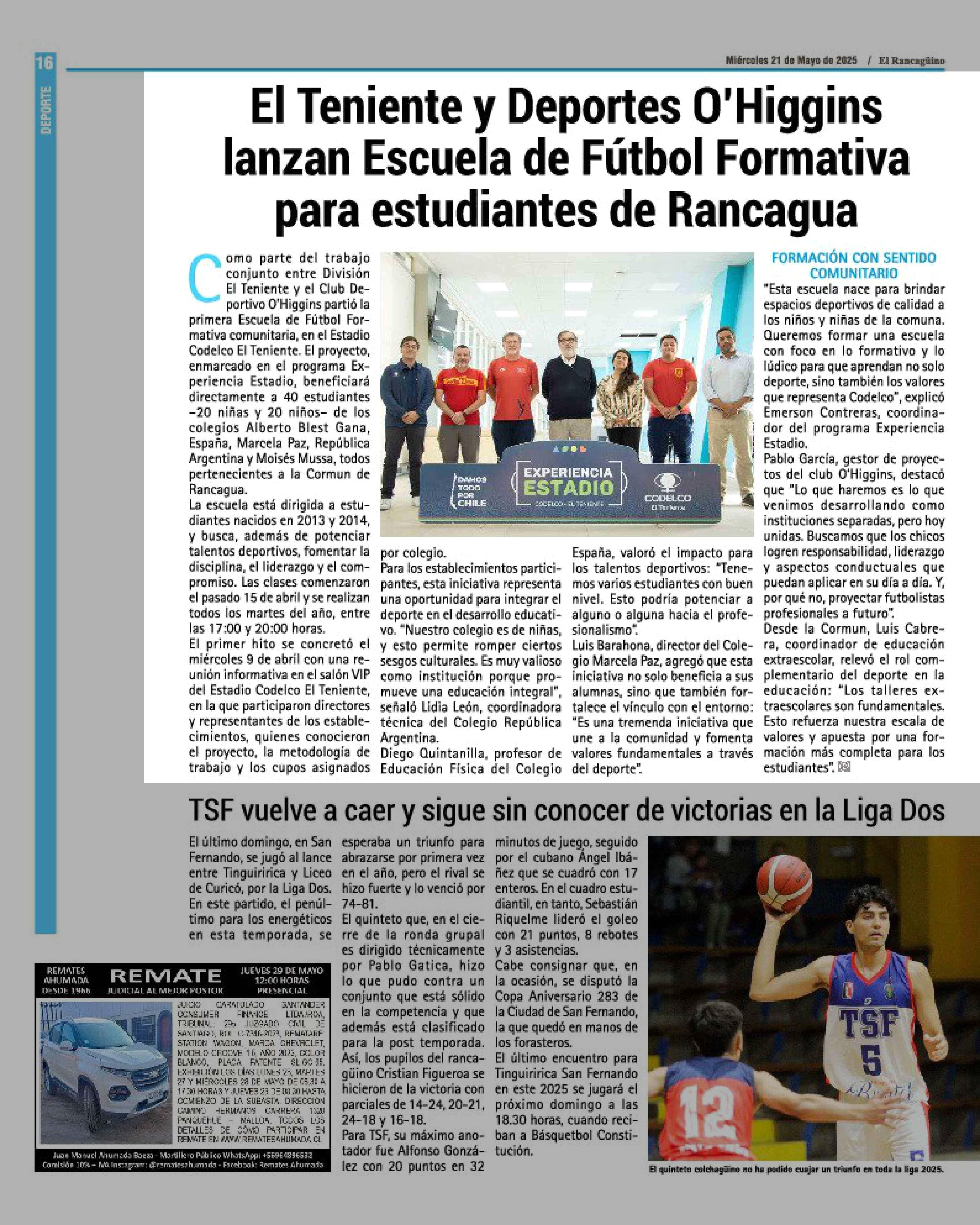 El Teniente y Deportes O'Higgins lanzan Escuela de Fútbol Formativa para estudiantes de Rancagua 21-05-2025 El Rancagüino |