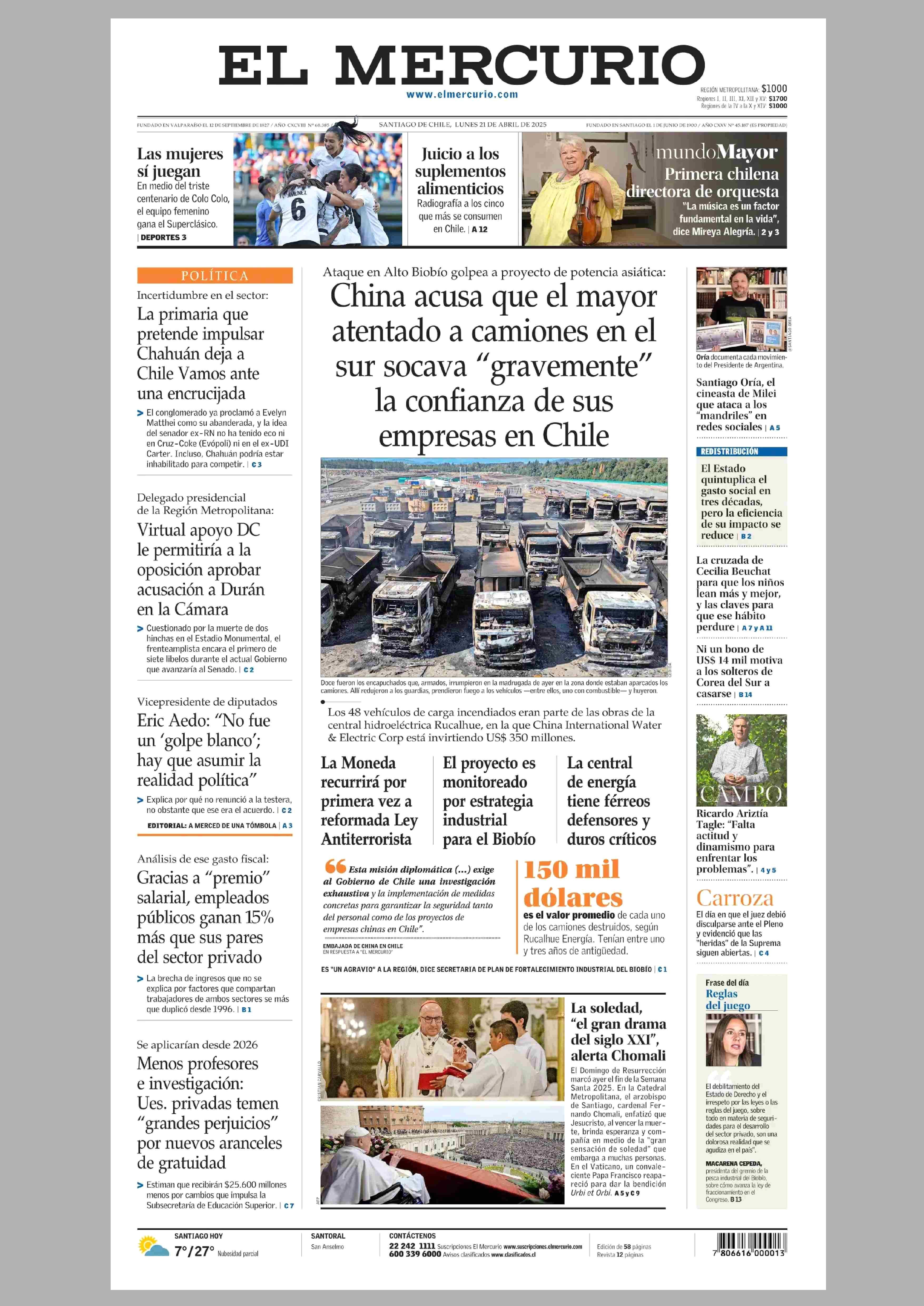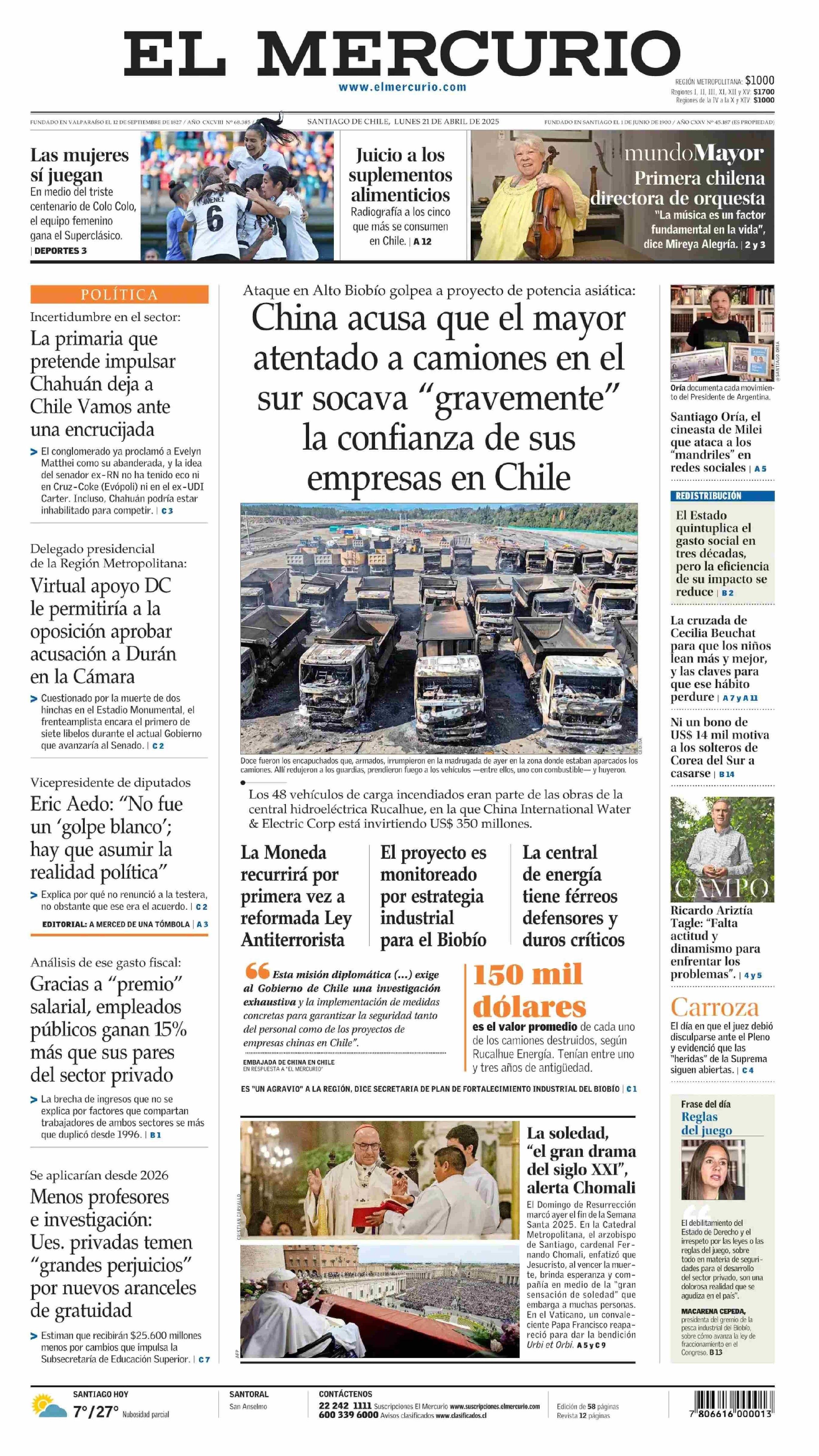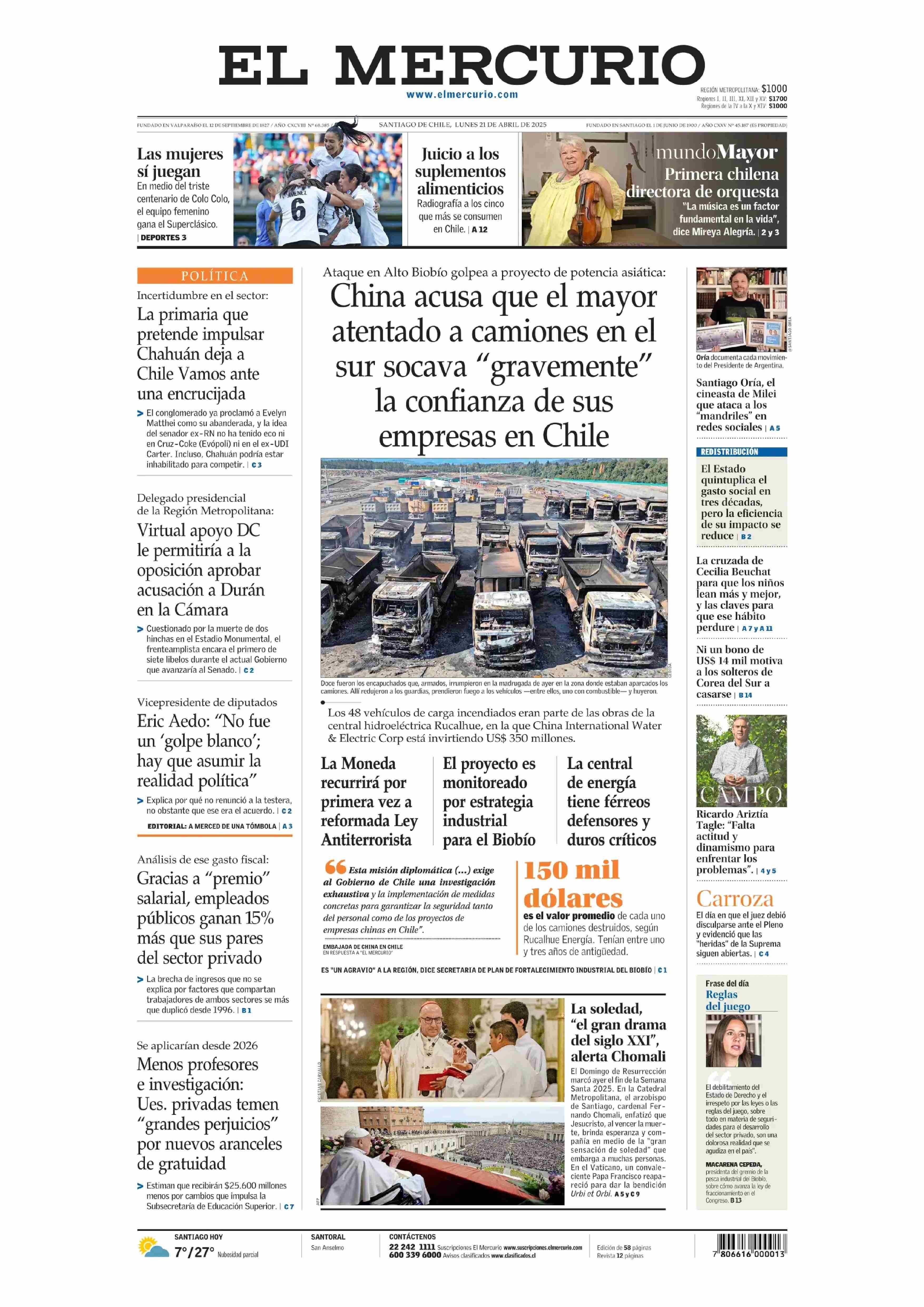 PORTADA EL MERCURIO (A) - CHILE 21-04-2025 El Mercurio |