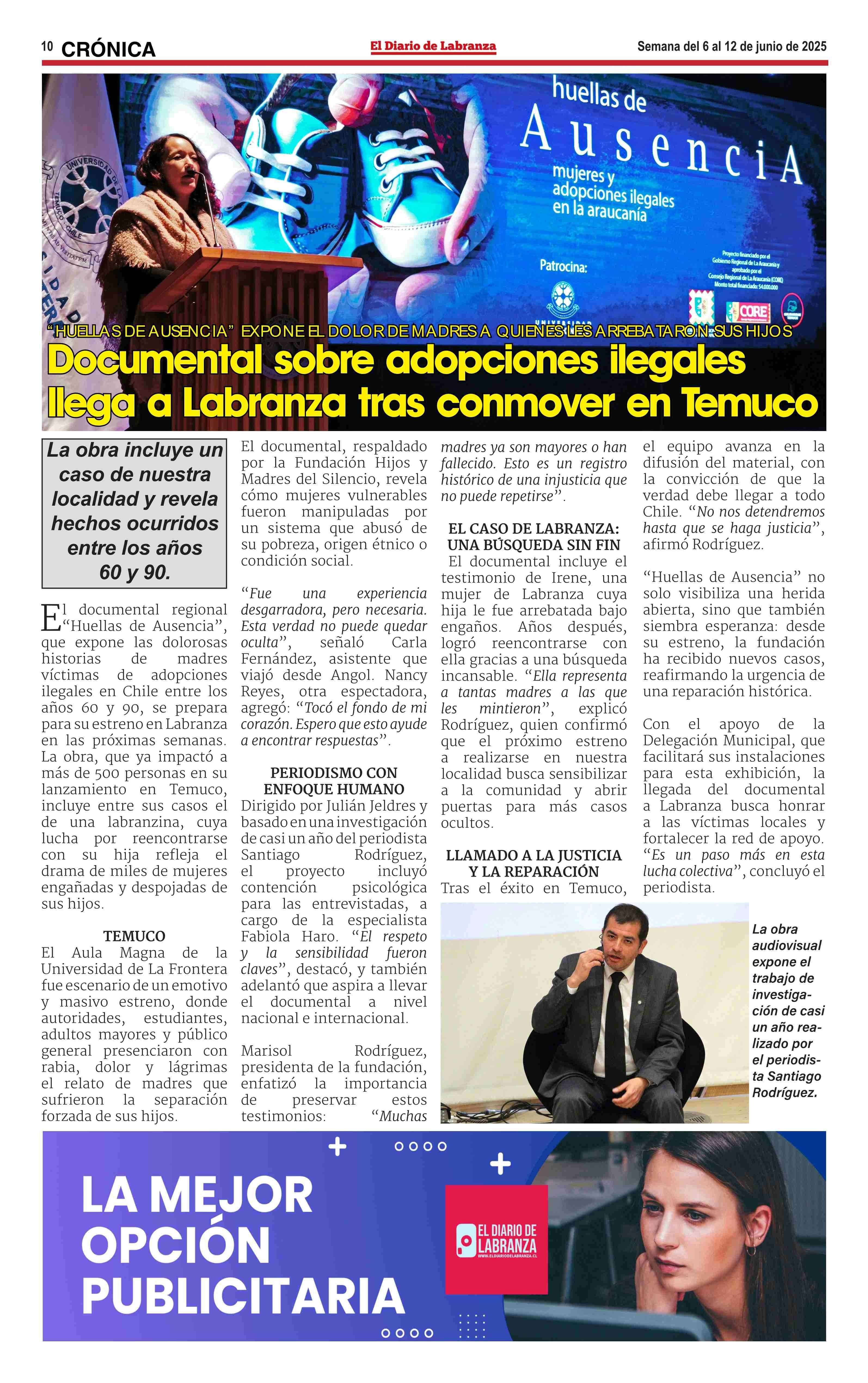 Documental sobre adopciones ilegales llega a Labranza tras conmover en Temuco 09-06-2025 EL DIARIO DE LABRANZA |