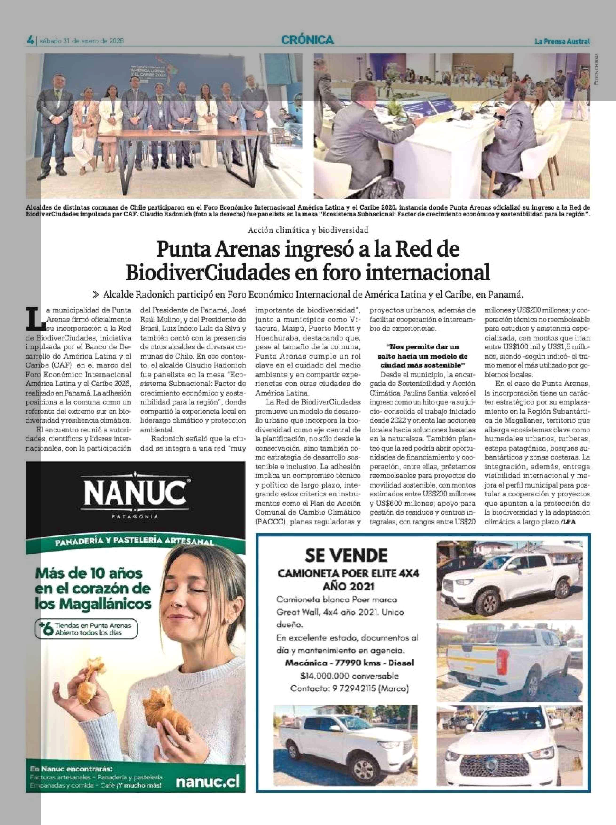 Punta Arenas ingresó a la Red de BiodiverCiudades en foro internacional 31-01-2026 La Prensa Austral |