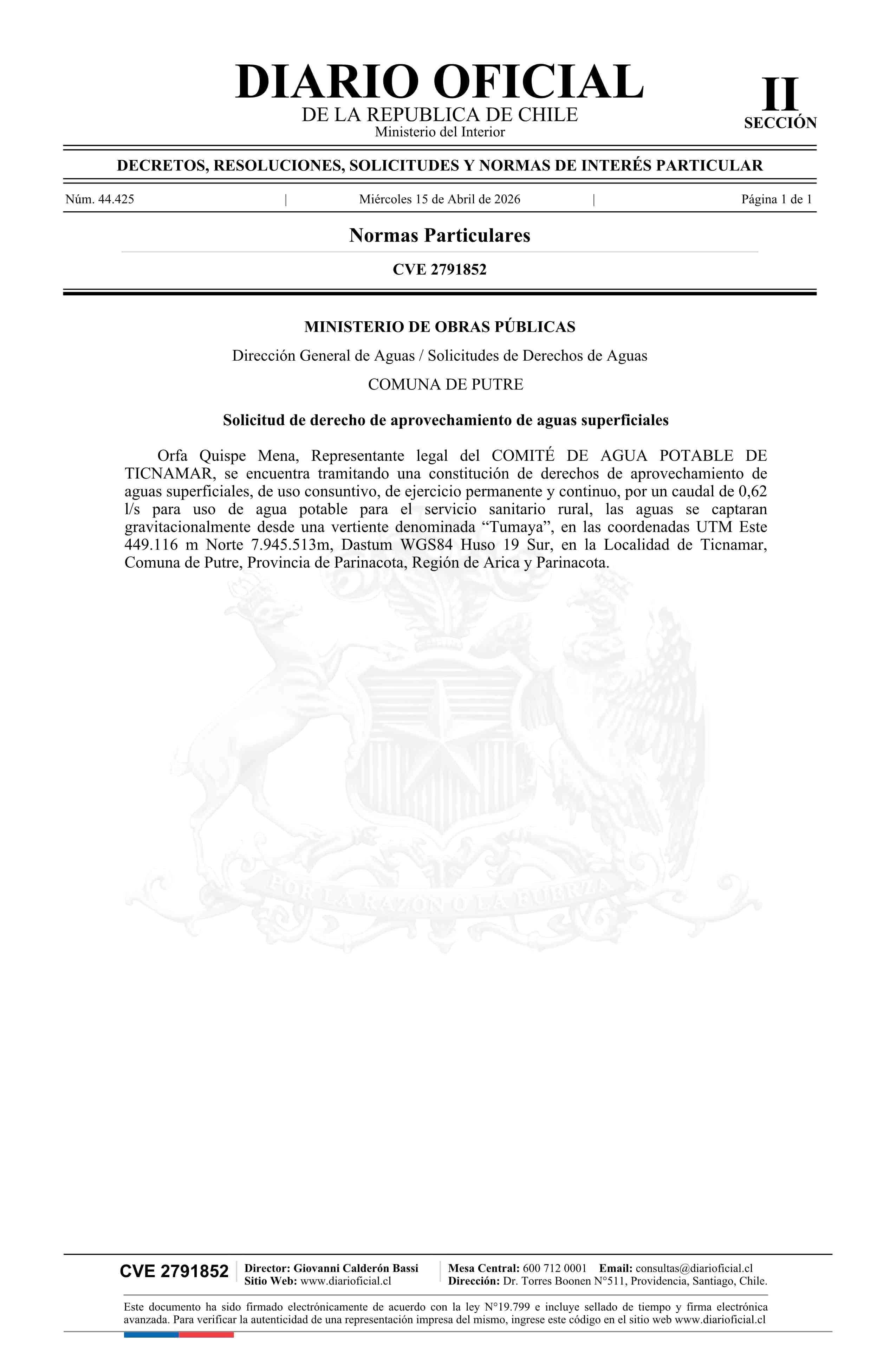 Solicitud Comité de Agua Potable de Ticnamar 15-04-2026 Diario Oficial Edición Electrónica |