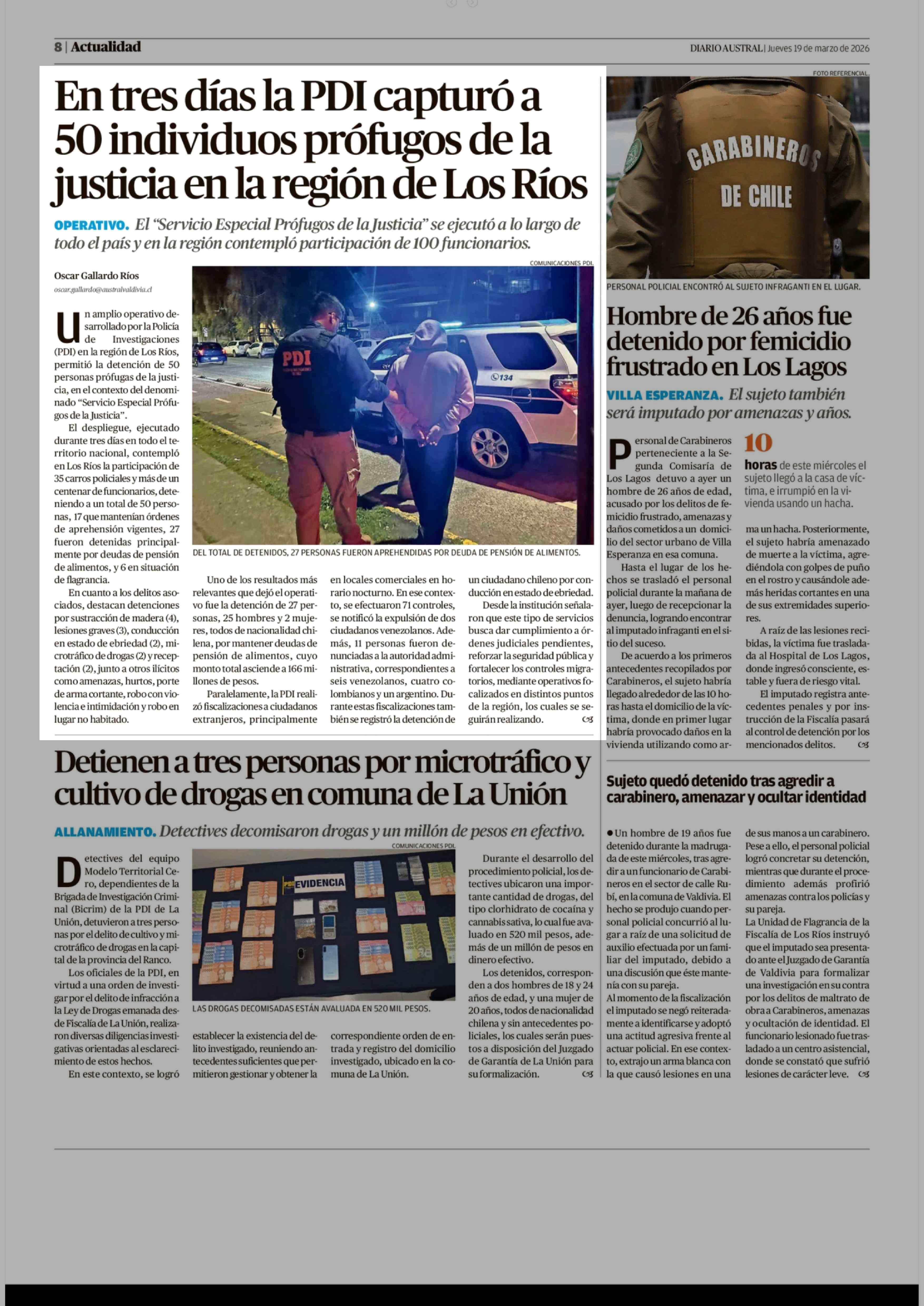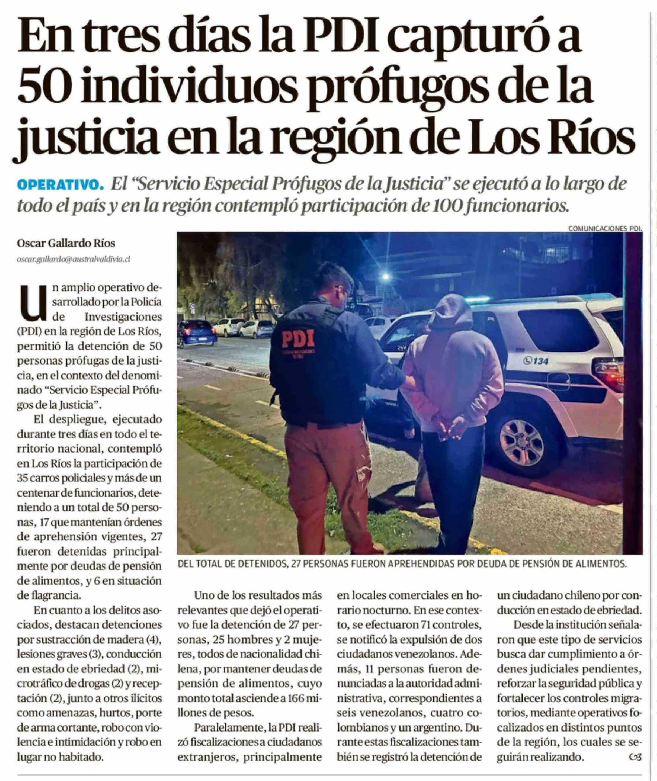 En tres días la PDI capturó a 50 individuos prófugos de la justicia en la región de Los Ríos 19-03-2026 Diario Austral Región de Los Ríos |