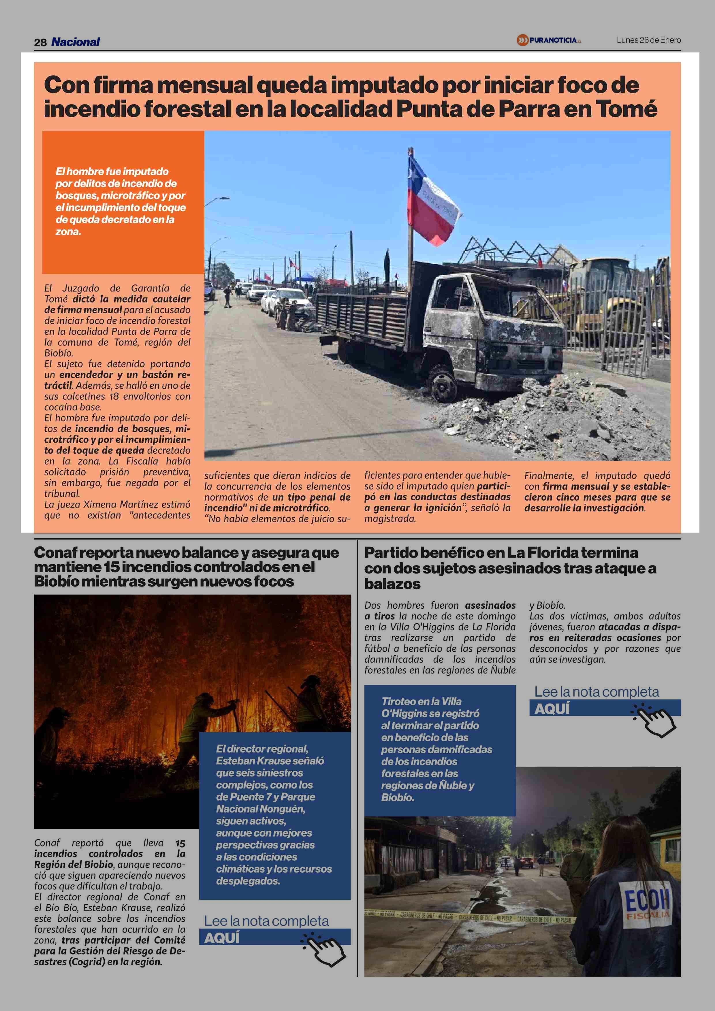 Con firma mensual queda imputado por iniciar foco de incendio forestal en la localidad Punta de Parra en Tomé 26-01-2026 Puranoticia.cl |