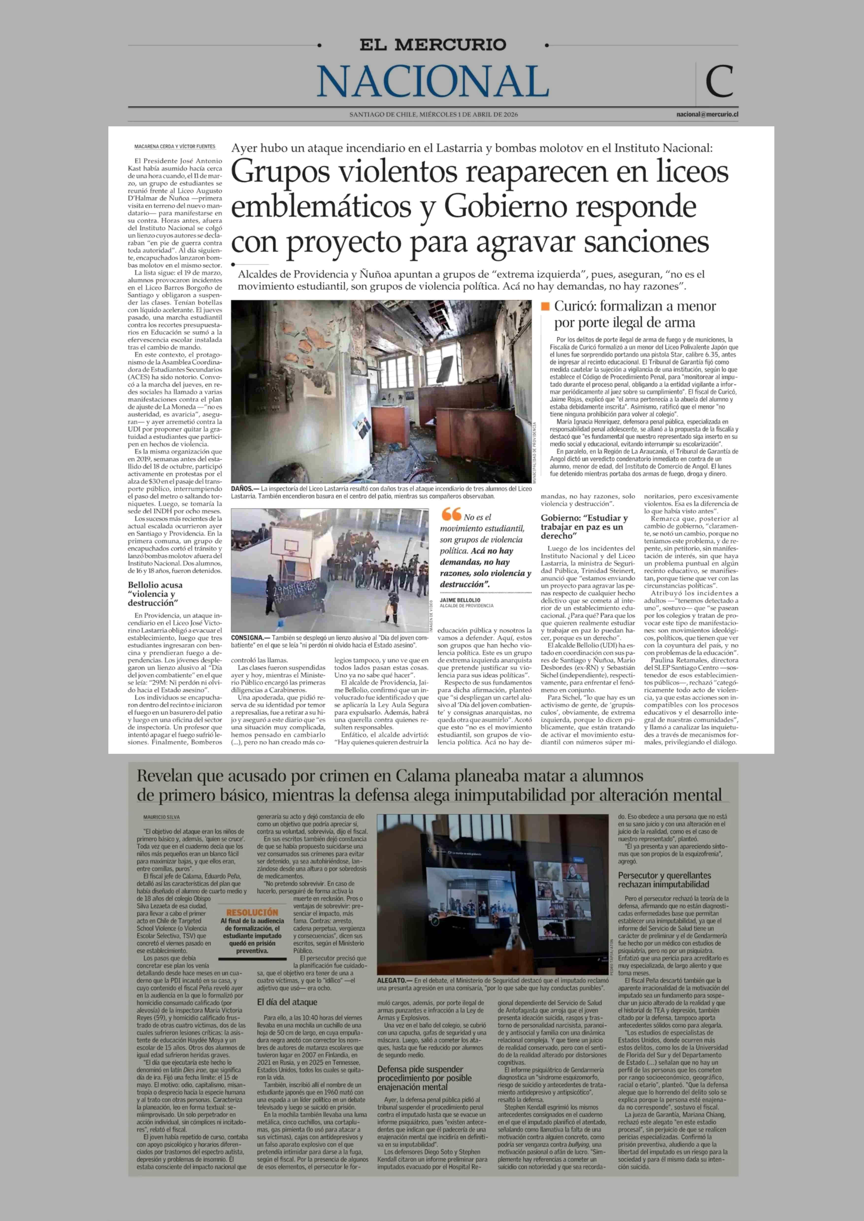 Grupos violentos reaparecen en liceos emblemáticos y Gobierno responde con proyecto para agravar sanciones 01-04-2026 El Mercurio |