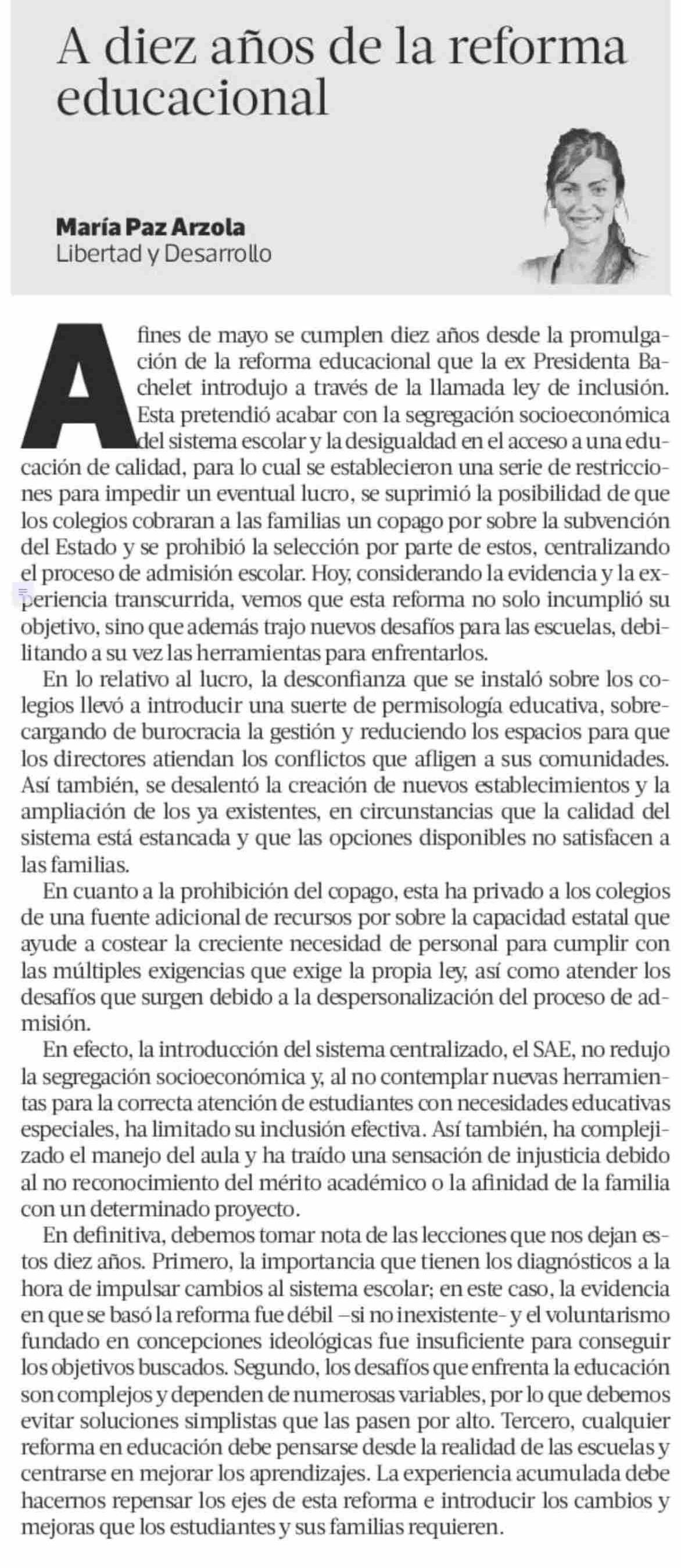 Columnas de Opinión: A diez años de la reforma educacional 12-05-2025 La Tercera |