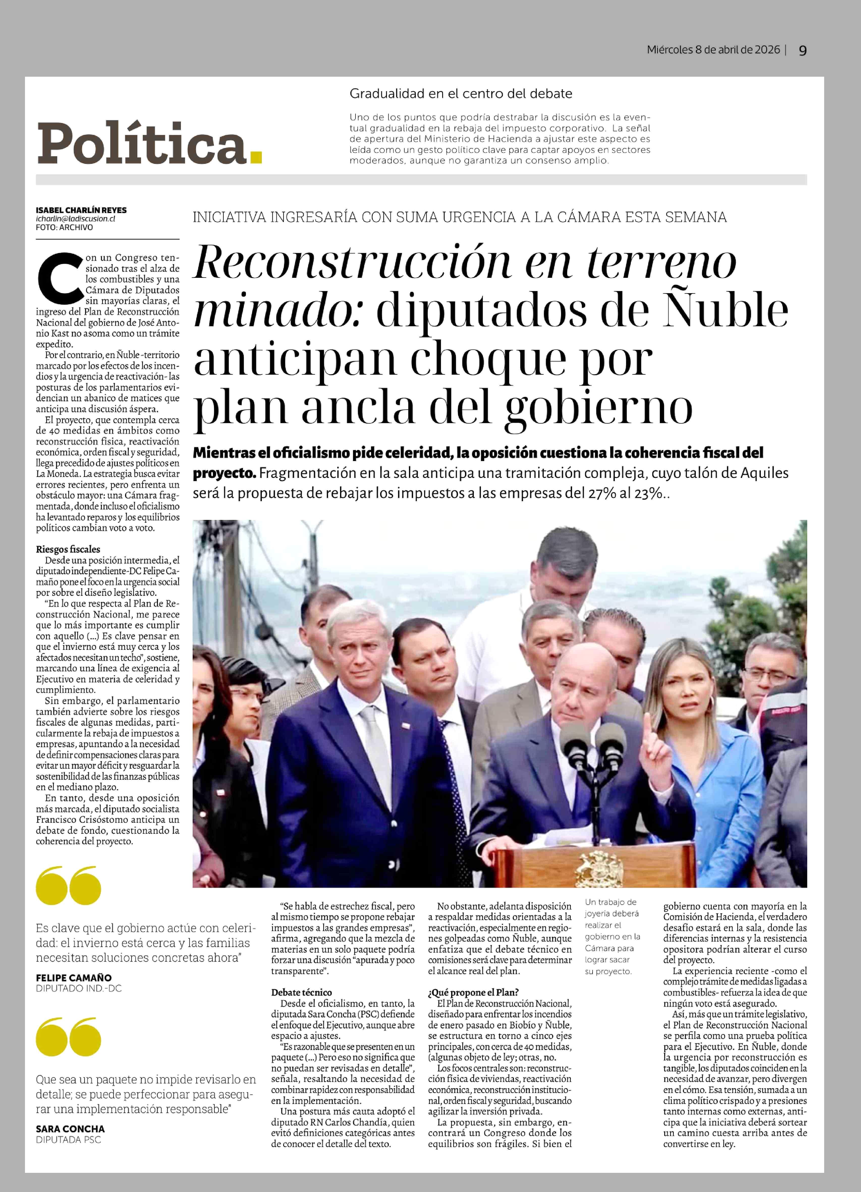 Título: Reconstrucción en terreno minado: diputados de Nuble anticipan choque por plan ancla del gobierno