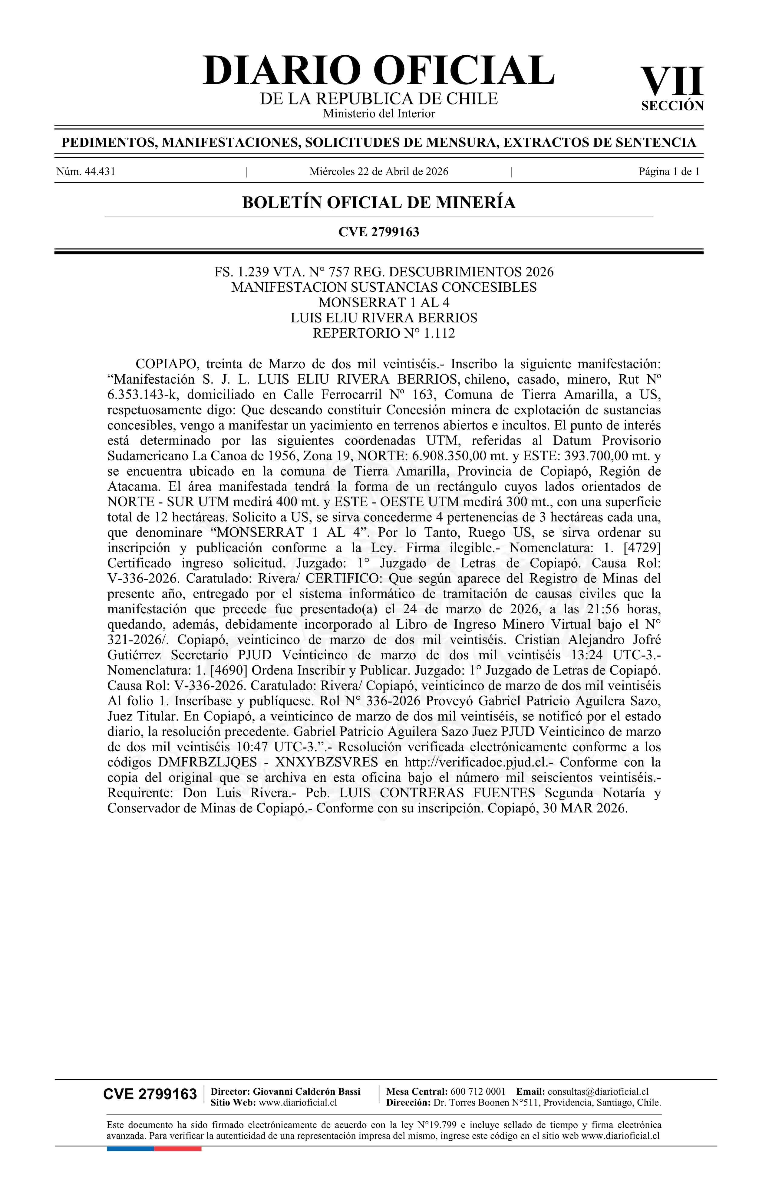 MONSERRAT 1 AL 4 / Rivera Berríos Luis Eliu 22-04-2026 DIARIO OFICIAL CHILE - BOLETÍN OFICIAL DE MINERÍA |