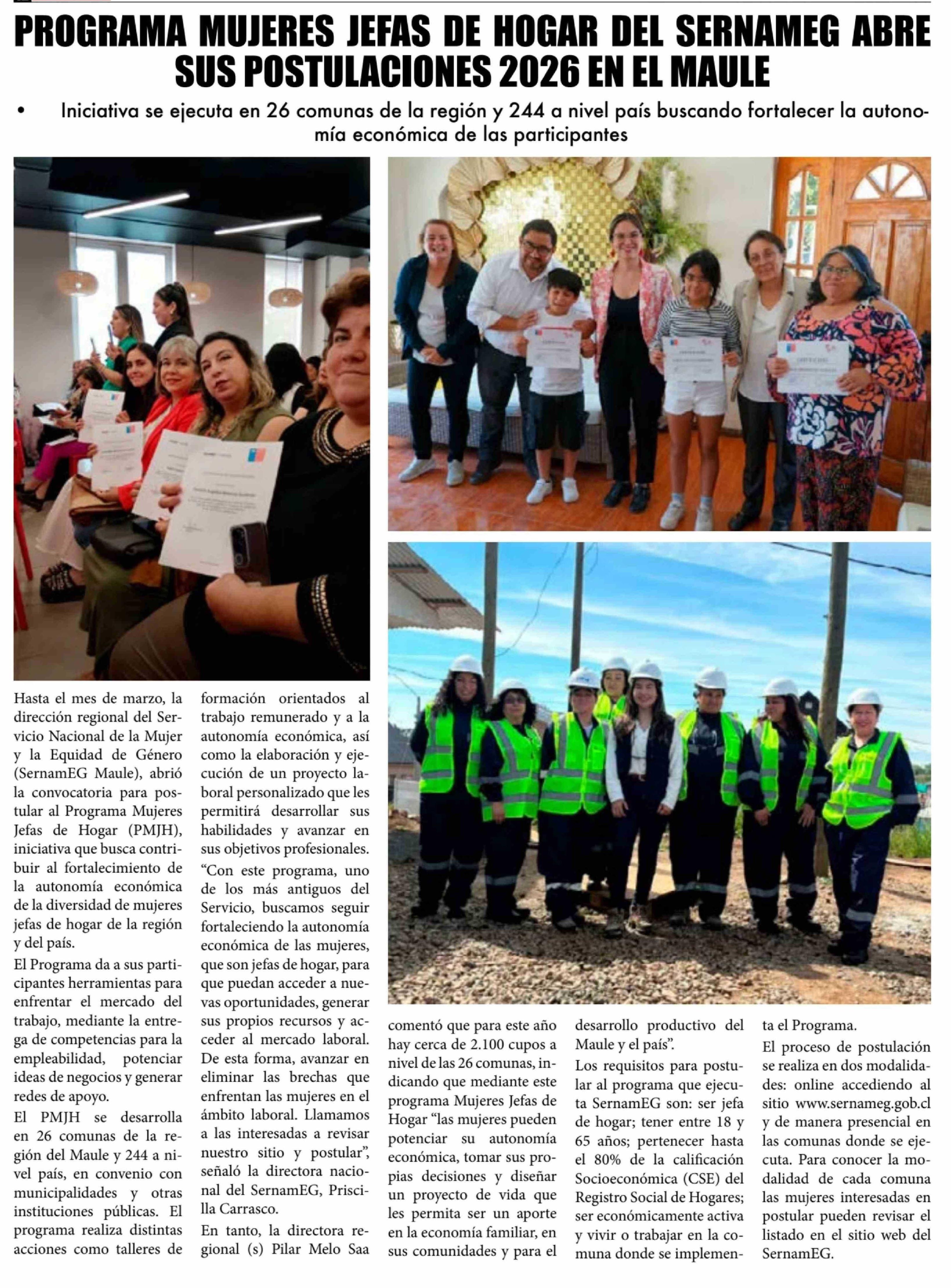 | Título: | PROGRAMA MUJERES JEFAS DE HOGAR DEL SERNAMEG ABRE SUS POSTULACIONES 2026 EN EL MAULE |