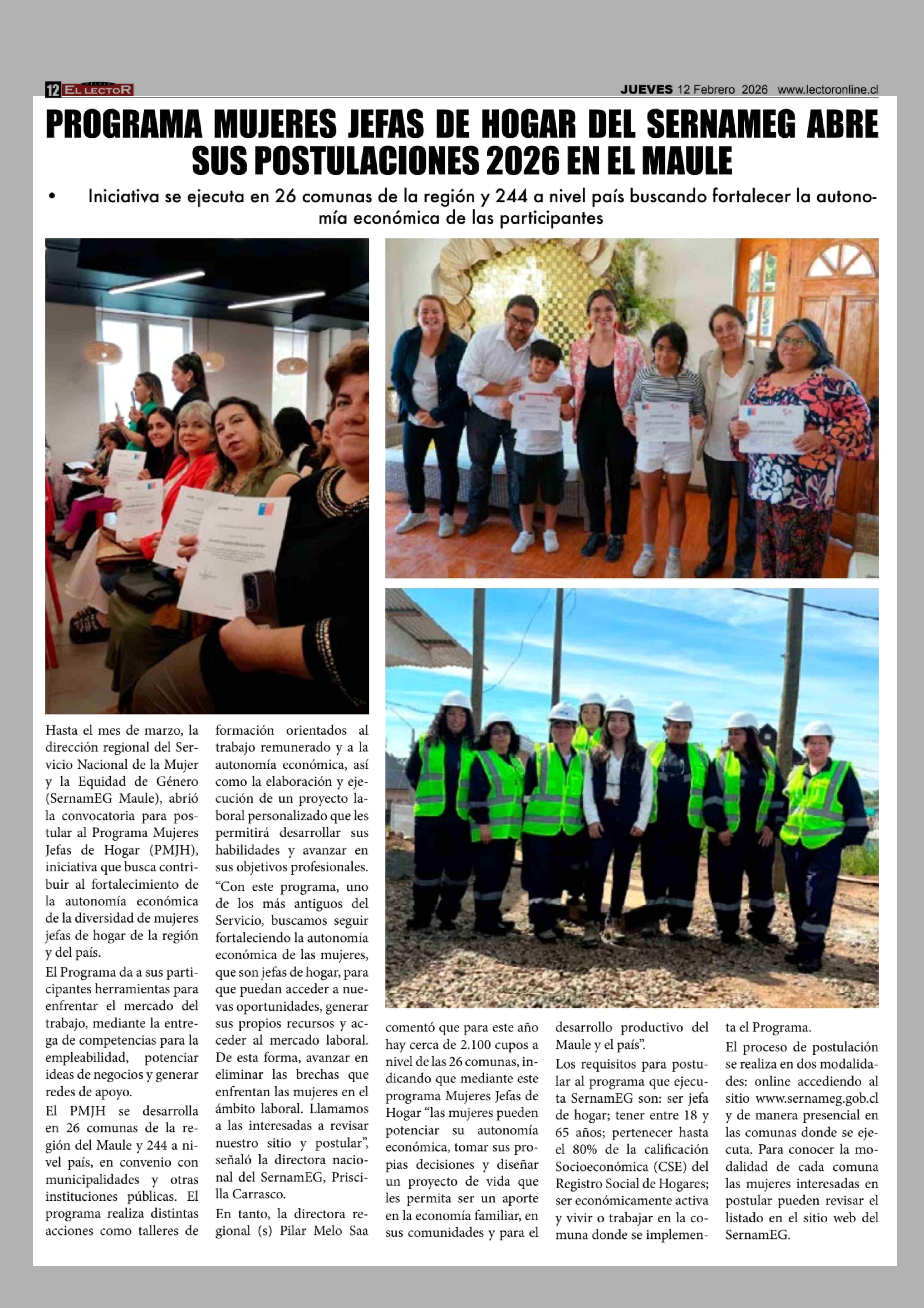 PROGRAMA MUJERES JEFAS DE HOGAR DEL SERNAMEG ABRE SUS POSTULACIONES 2026 EN EL MAULE 12-02-2026 El Lector |
