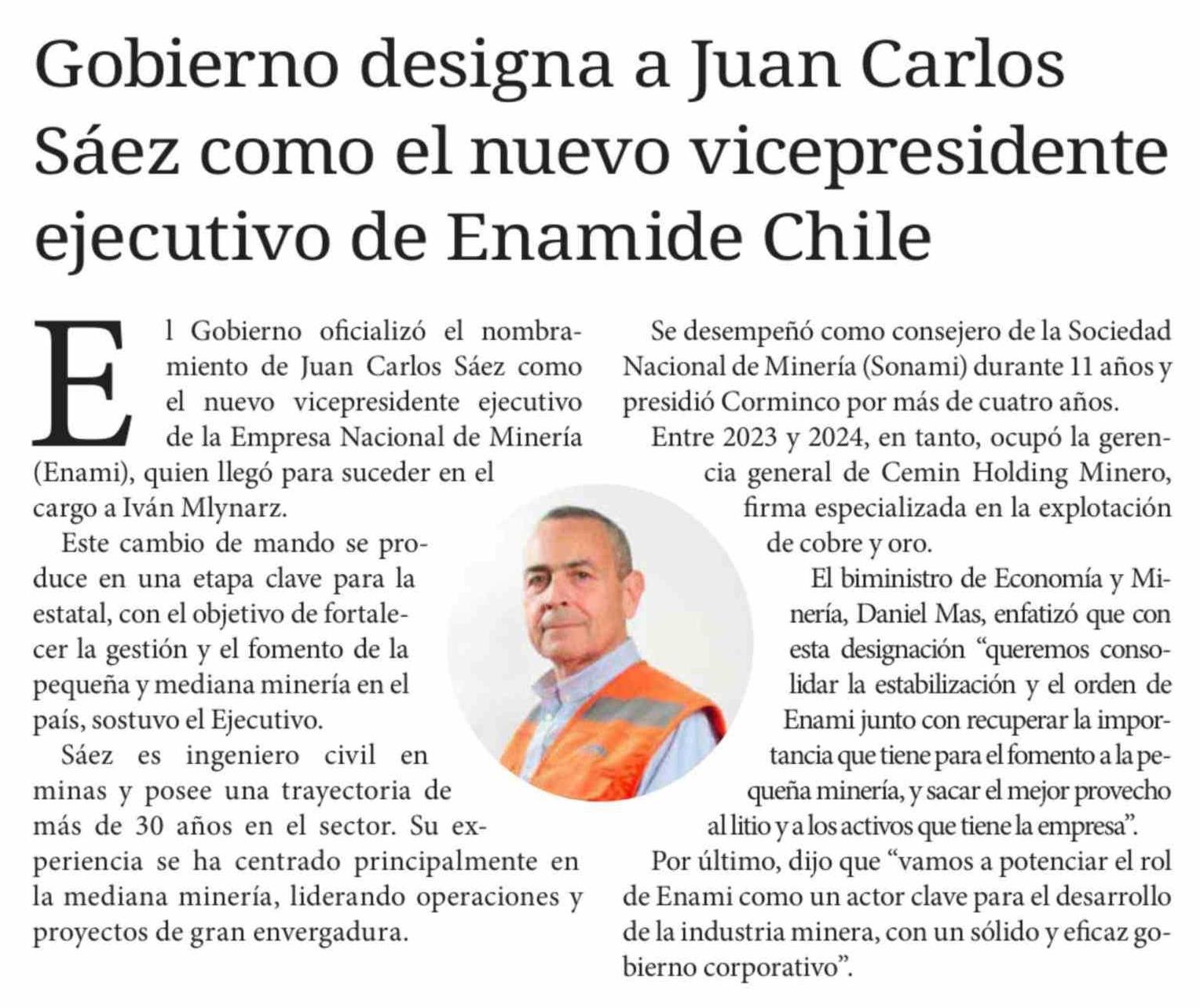 Título: Gobierno designa a Juan Carlos Sáez como el nuevo vicepresidente ejecutivo de Enamide Chile
