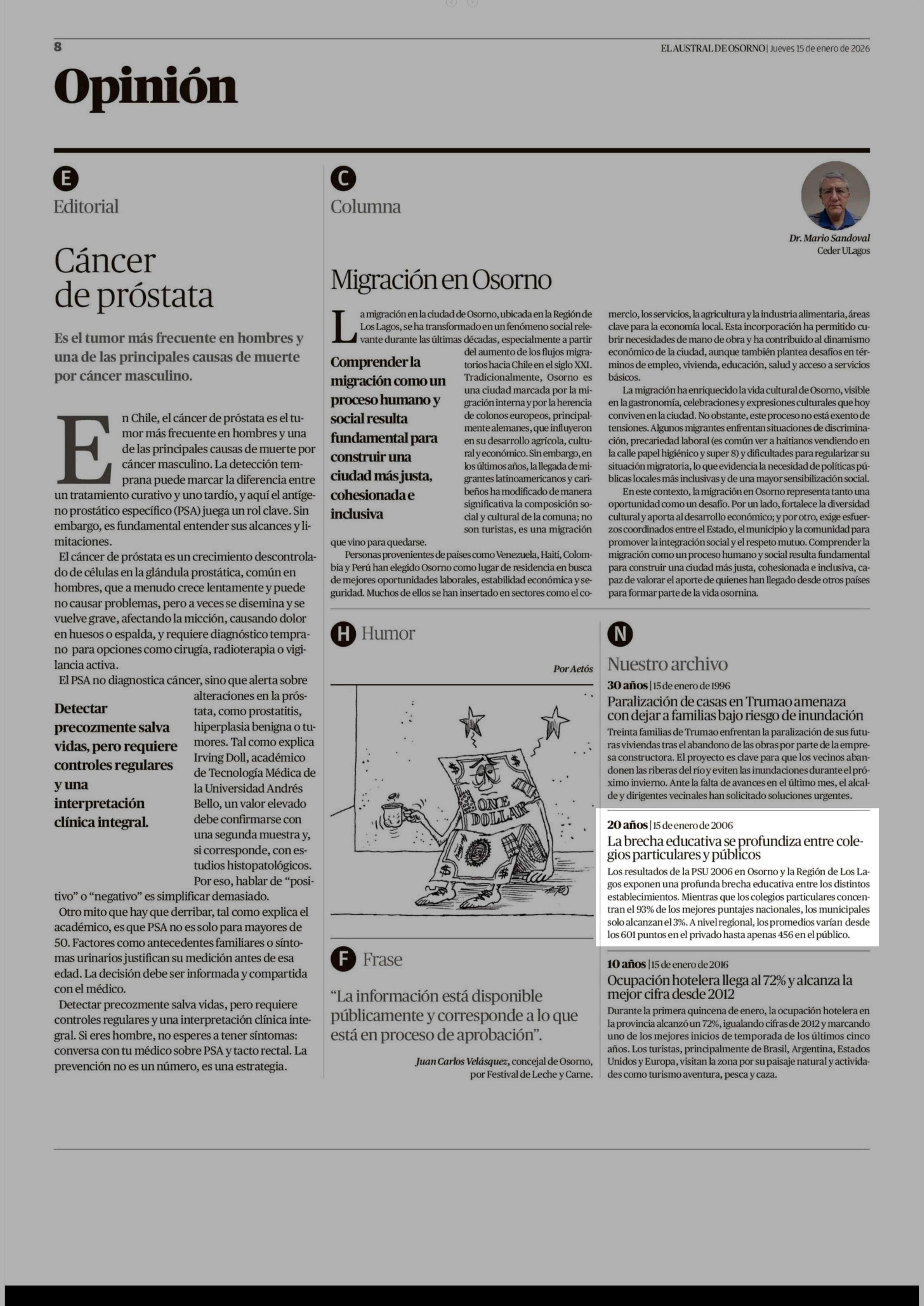 | Título: | 20 años | 15 de enero de 2006 La brecha educativa se profundiza entre colegios particulares y públicos Los resultados de la PSU 2006 en Osorno y la Región de Los Lagos exponen una profunda brecha educativa entre los distintos establecimientos. Mientras que los colegios particulares concentran el 93% |