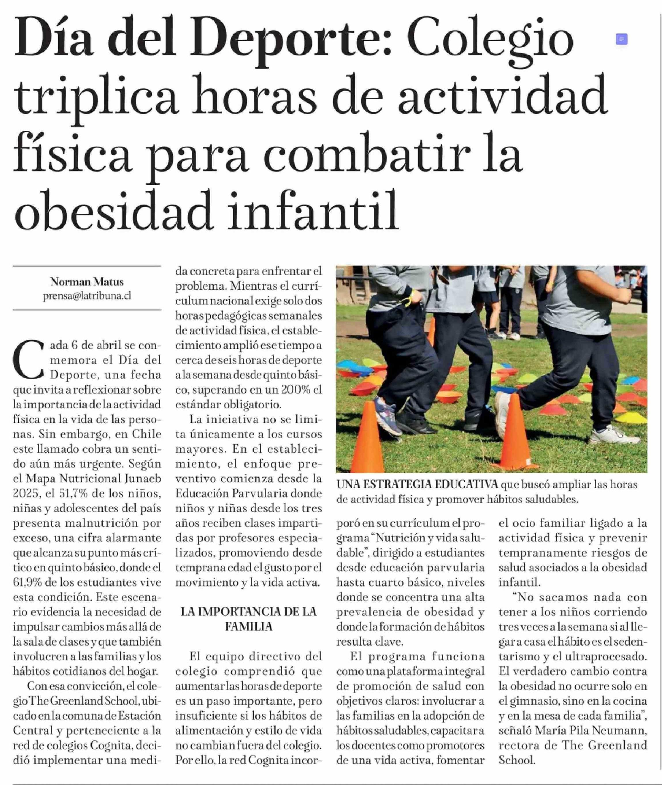 Día del Deporte: Colegio triplica horas de actividad física para combatir la obesidad infantil 07-04-2026 La Tribuna |