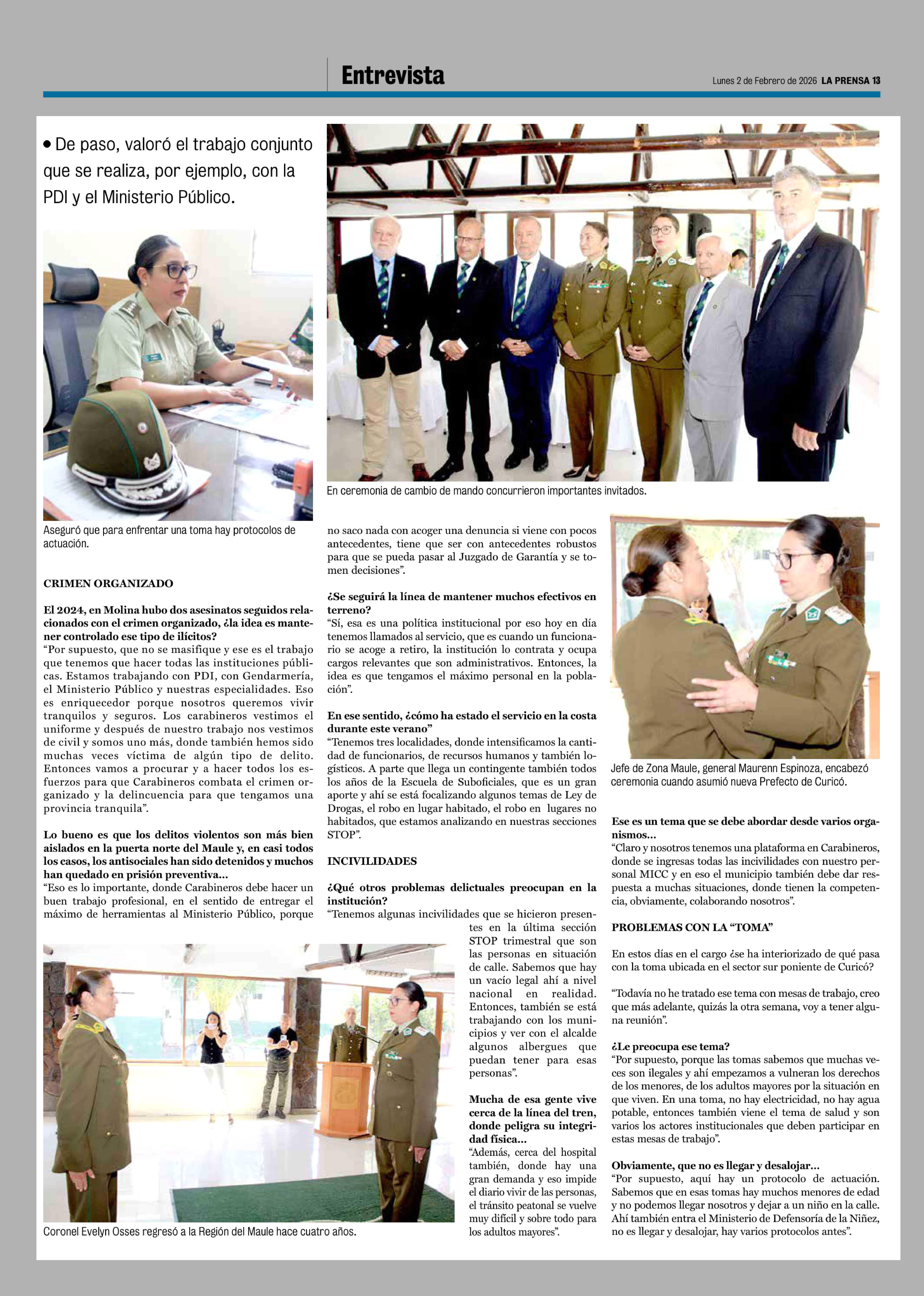 | Título: | El 2024, en Molina hubo dos asesinatos seguidos relacionados con el crimen organizado, ¿la idea es mantener controlado ese tipo de ilícitos? "Por supuesto, que no se masifique y ese es el trabajo que tenemos que hacer todas las instituciones públicas. Estamos trabajando con PDI, con Gendarmería, el |