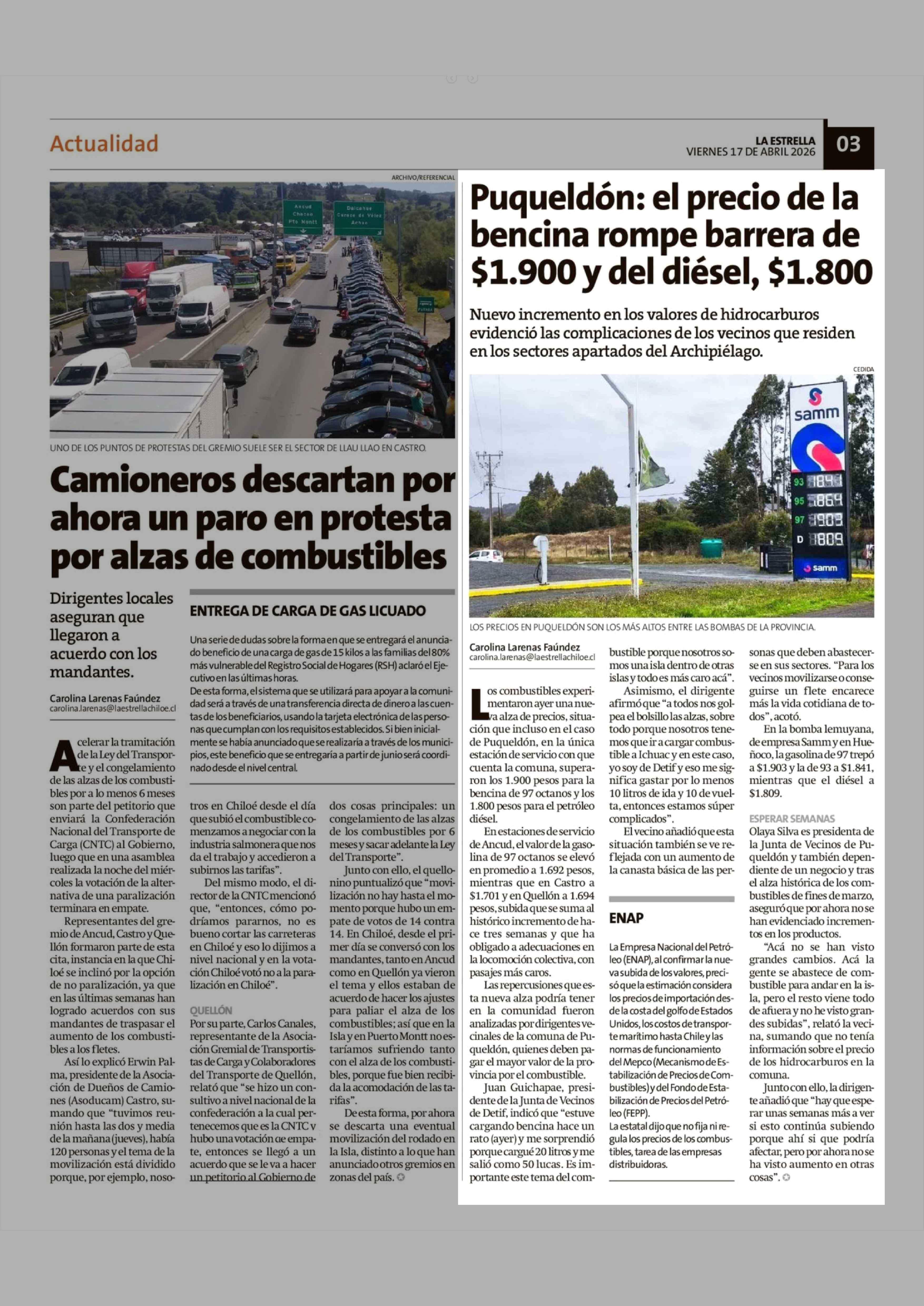 Puqueldón: el precio de la bencina rompe barrera de $1.900 y del diésel, $1.800 17-04-2026 La Estrella de Chiloé |