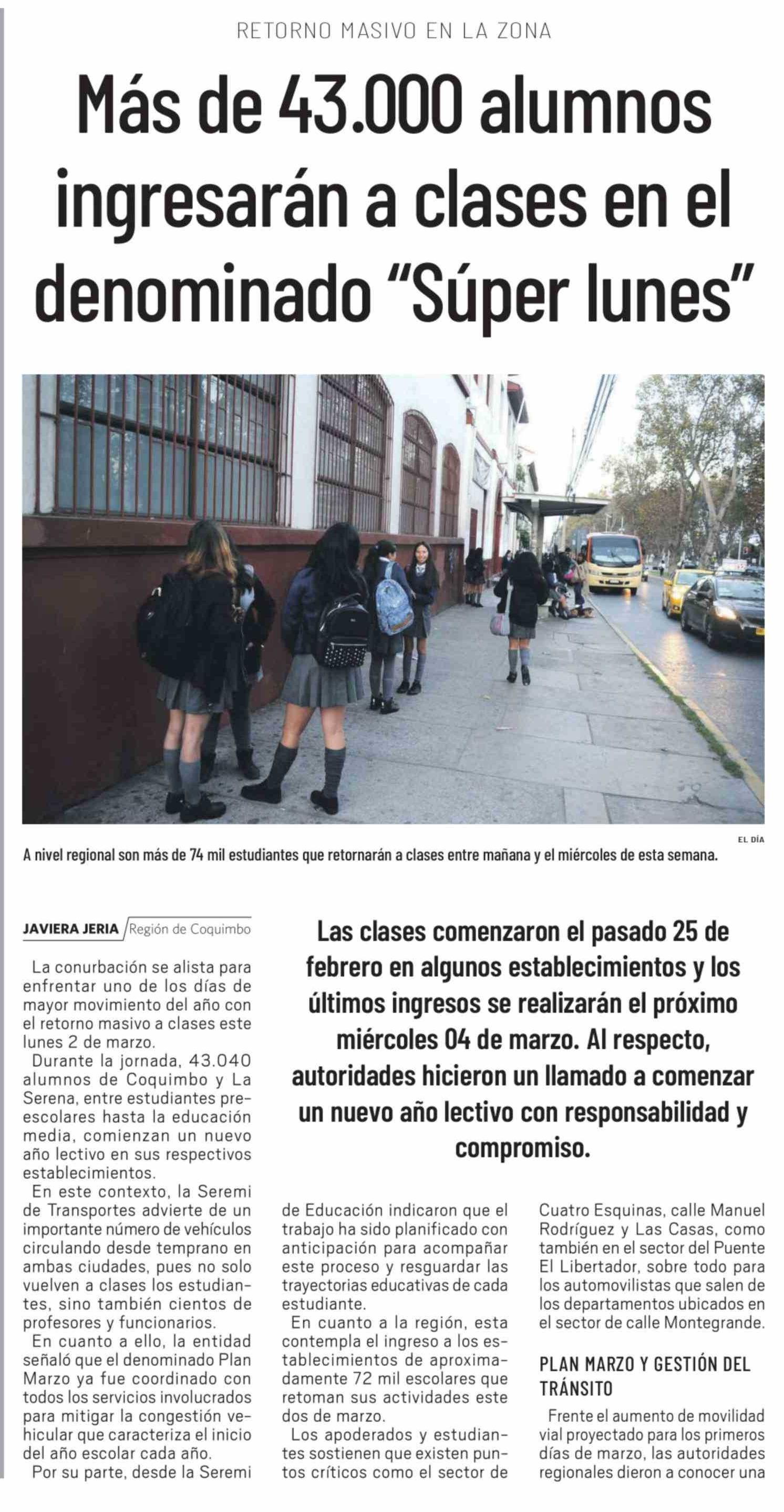 Más de 43.000 alumnos ingresarán a clases en el denominado "Súper lunes" 02-03-2026 El Día |
