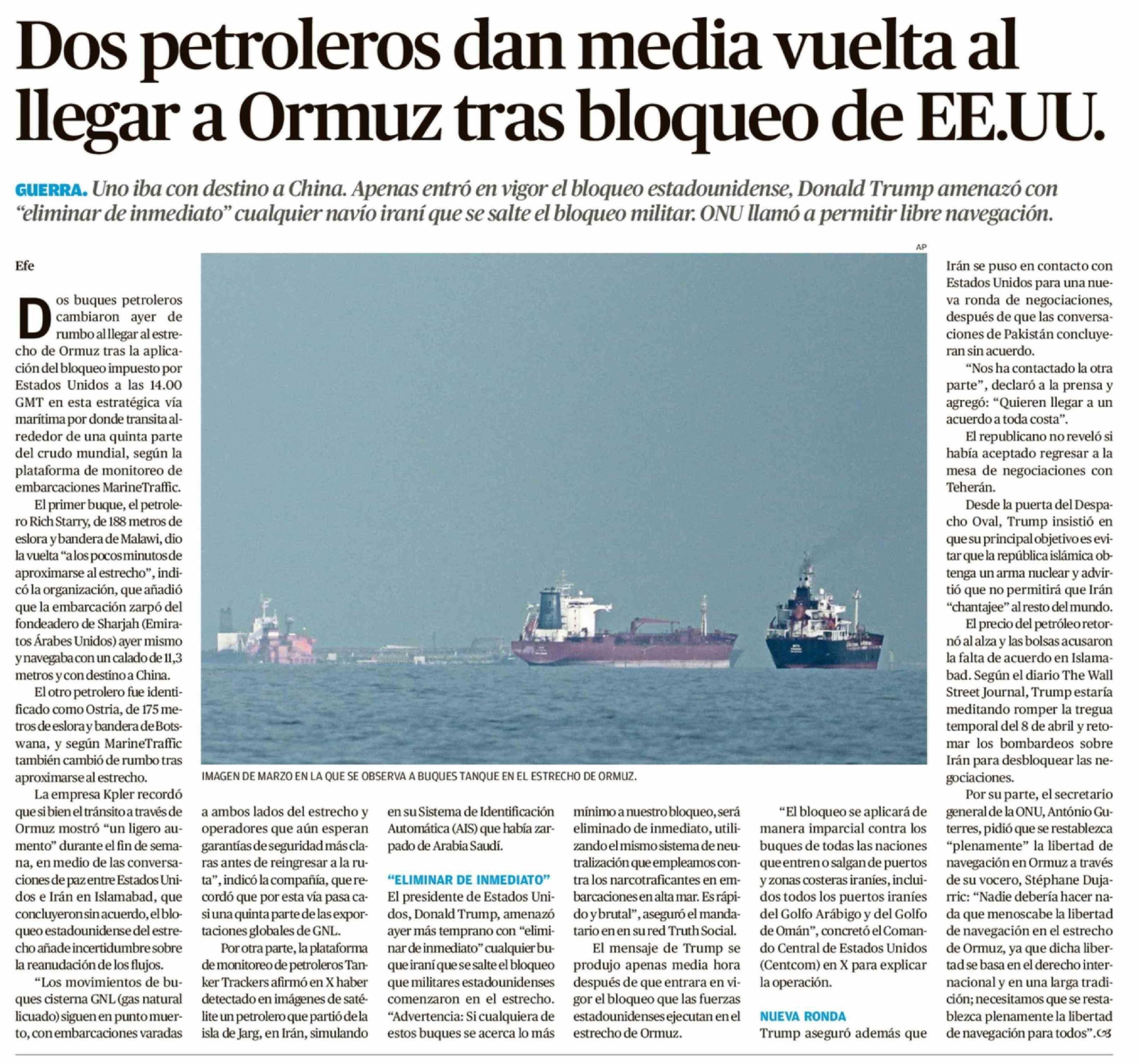 Título: Dos petroleros dan media vuelta al llegar a Ormuz tras bloqueo de EE.UU.