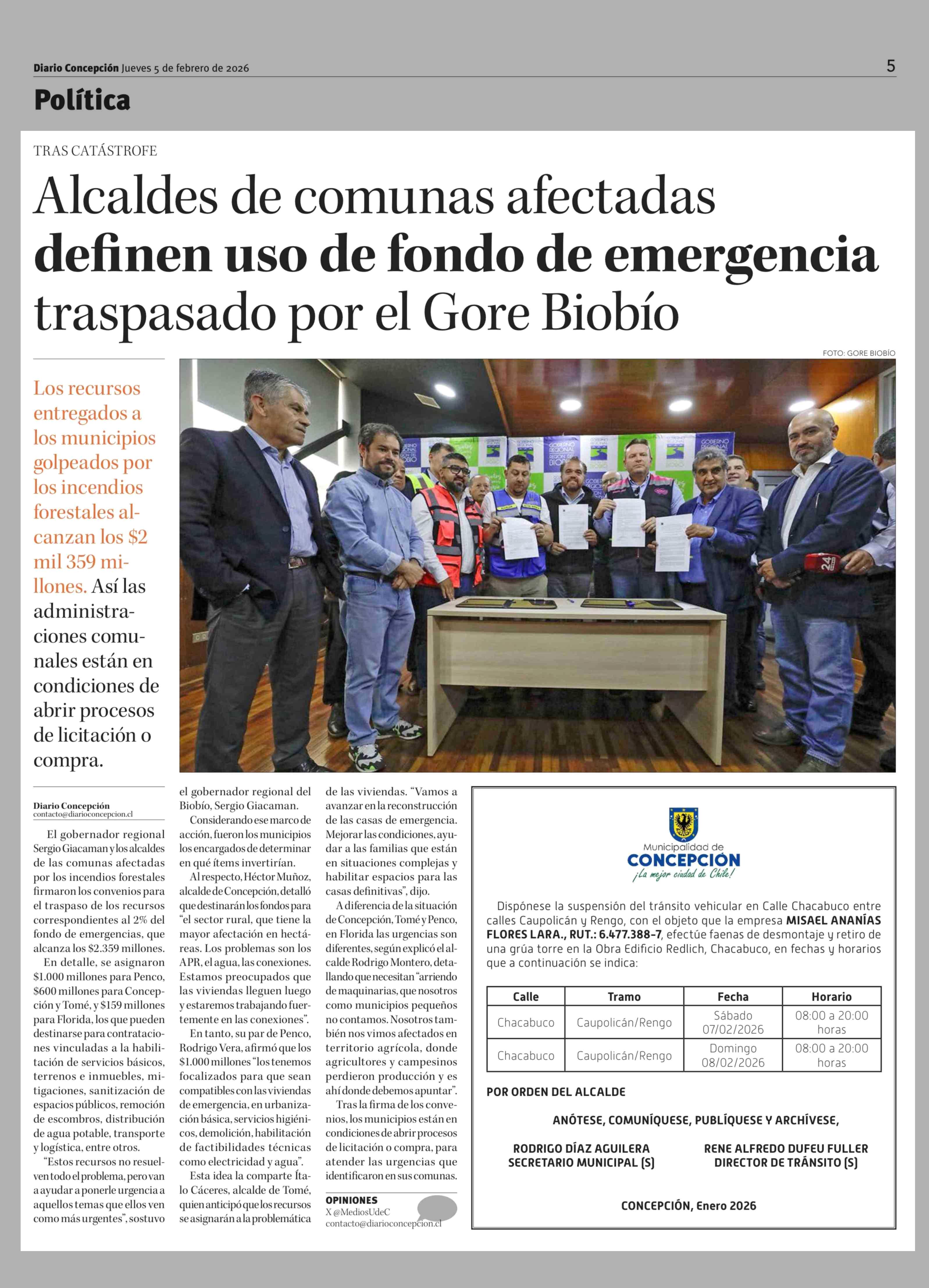 Alcaldes de comunas afectadas definen uso de fondo de emergencia traspasado por el Gore Biobío 05-02-2026 Diario Concepción |