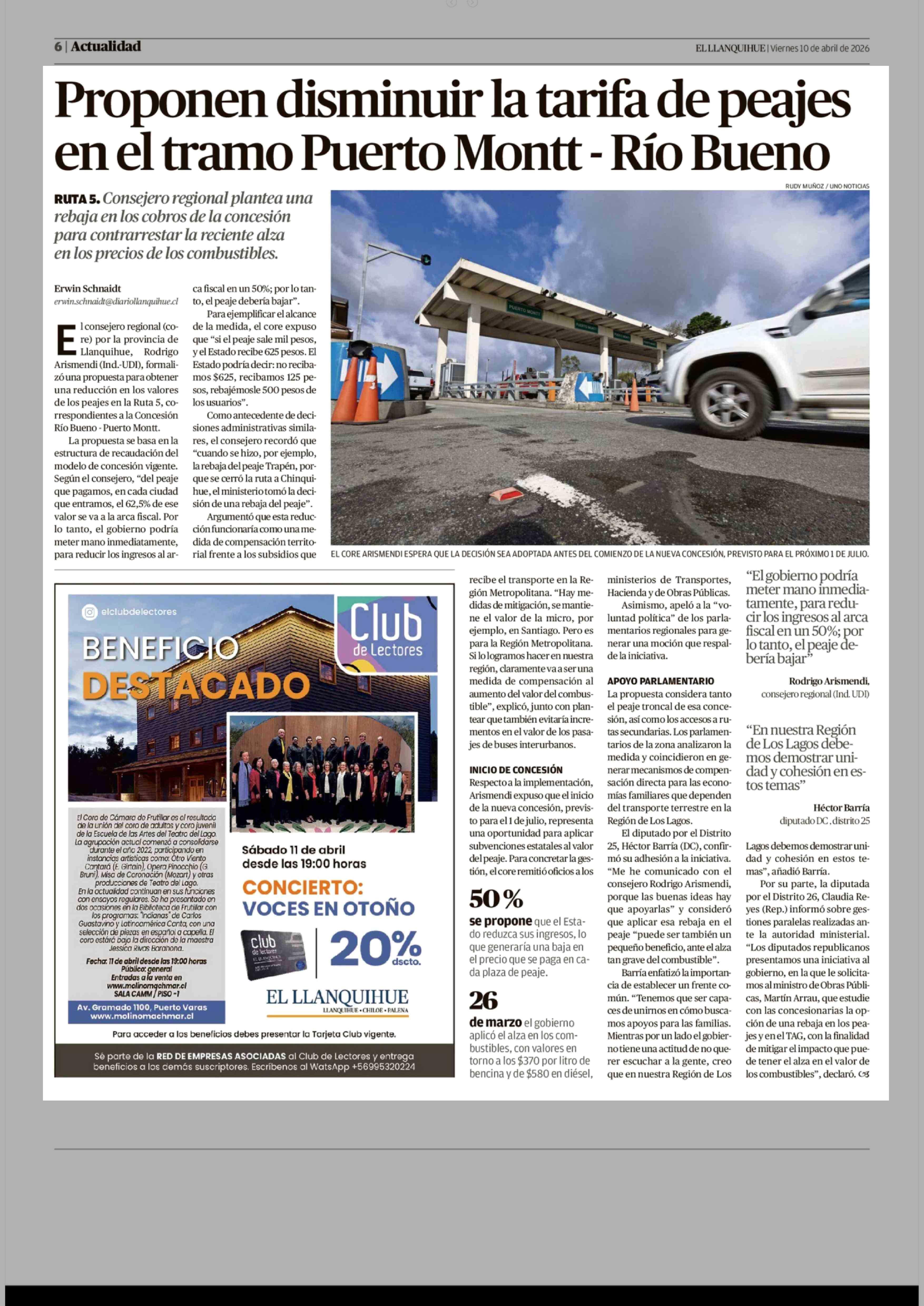 Título: Proponen disminuir la tarifa de peajes en el tramo Puerto Montt - Río Bueno