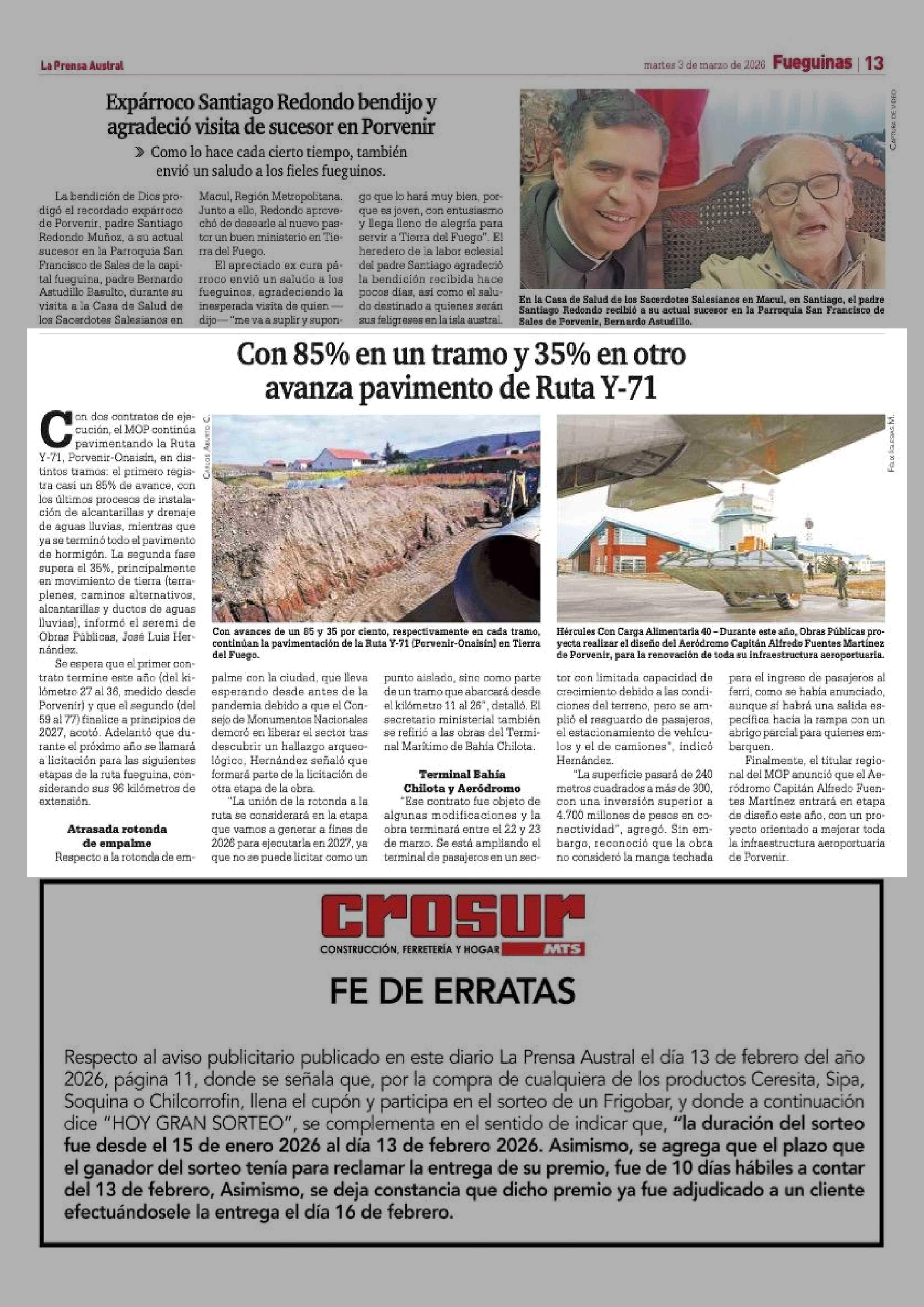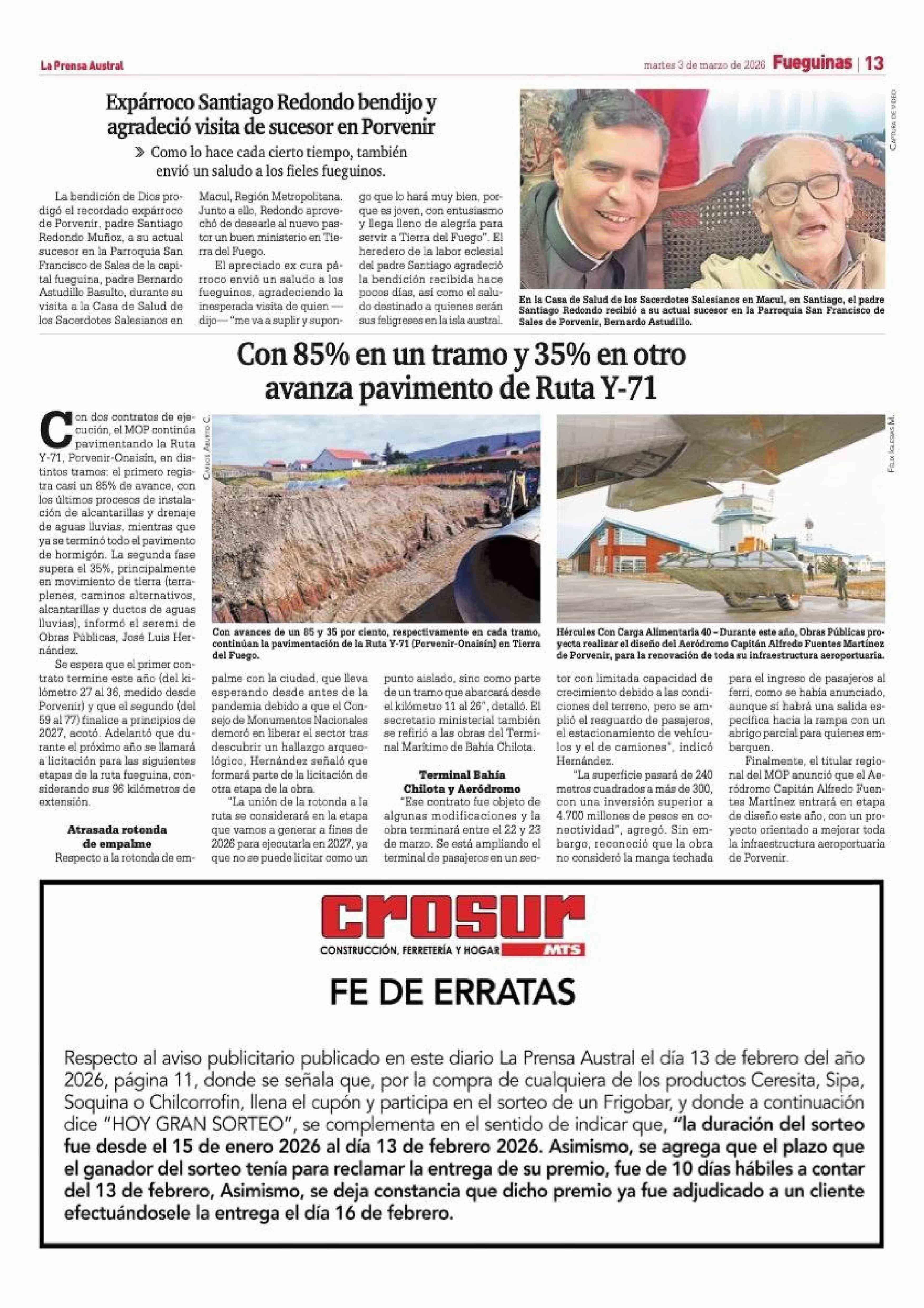 Con 85% en un tramo y 35% en otro avanza pavimento de Ruta Y-71 03-03-2026 La Prensa Austral |