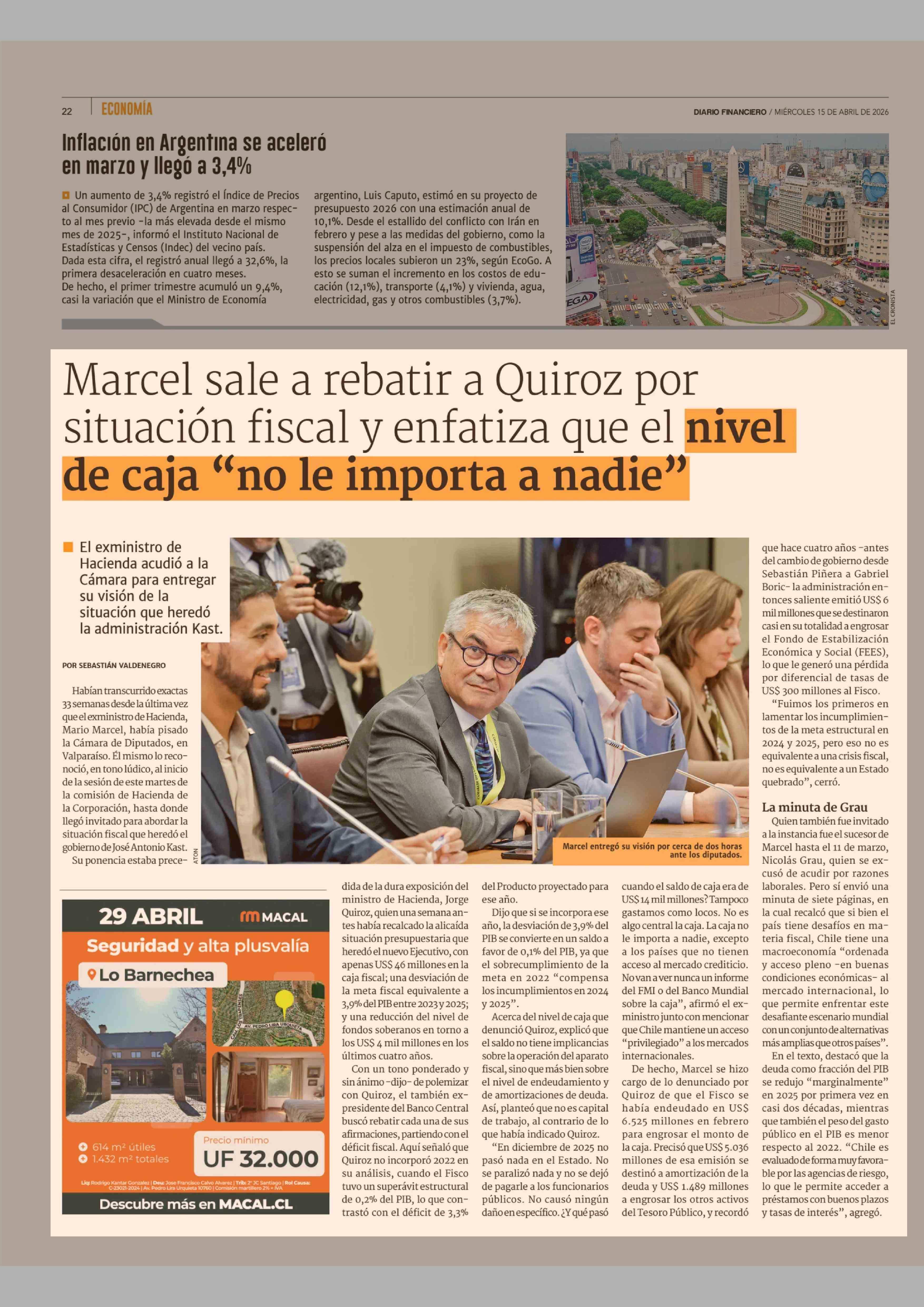 Marcel sale a rebatir a Quiroz por situación fiscal y enfatiza que el nivel de caja "no le importa a nadie' 15-04-2026 Diario Financiero |