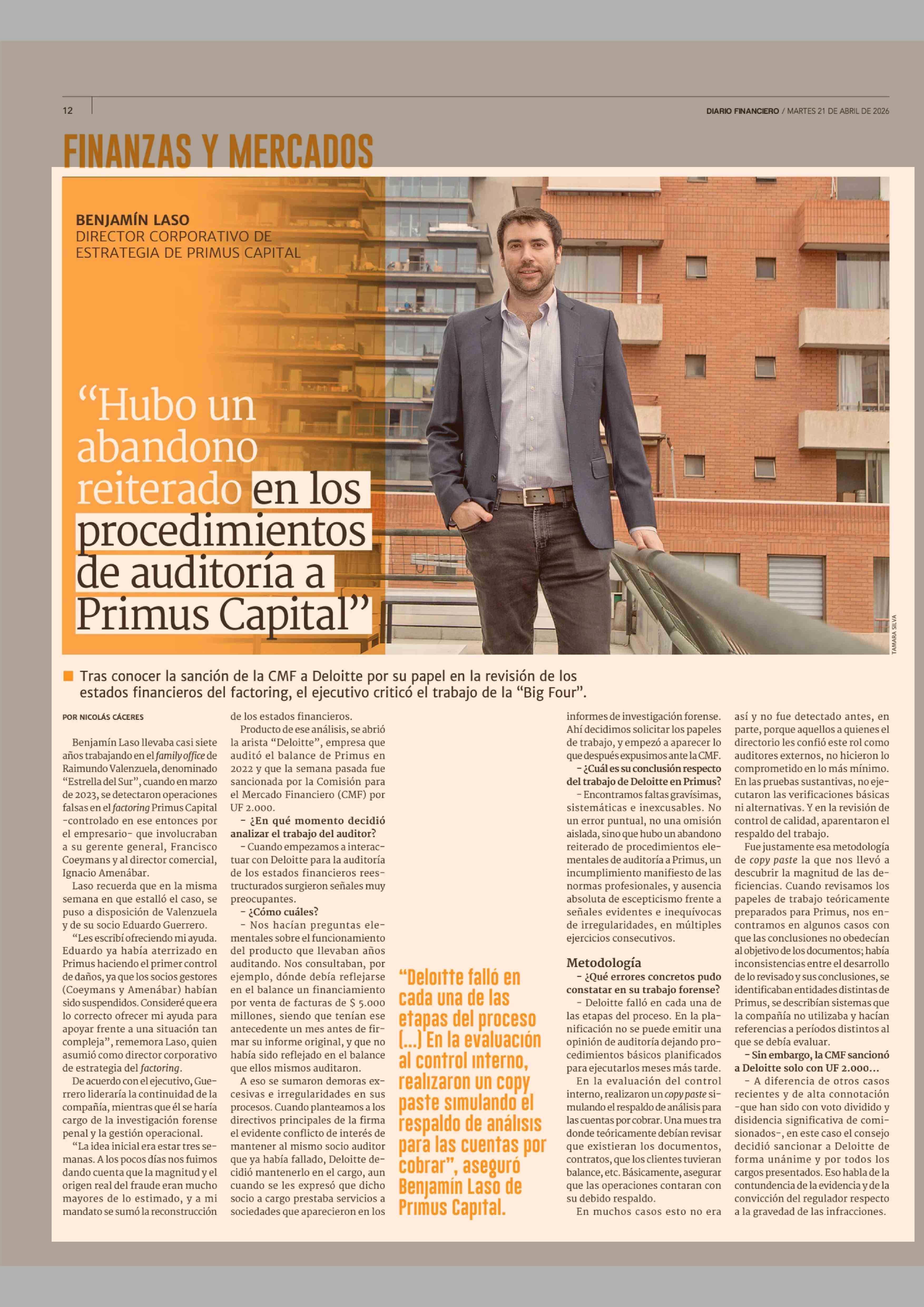 Título: "Hubo un abandono reiterado en los procedimientos de auditoría a Primus Capital"