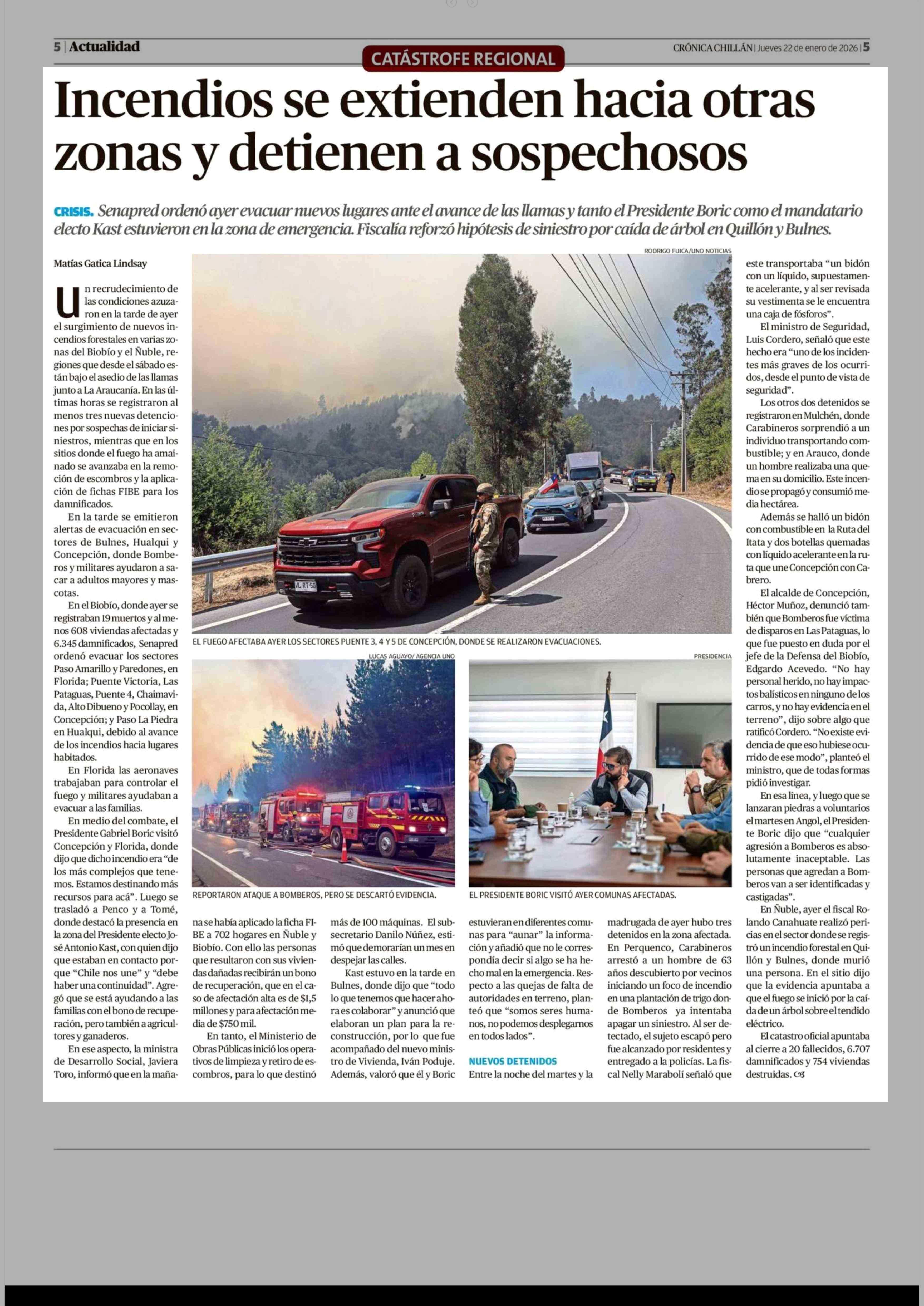 Incendios se extienden hacia otras zonas y detienen a sospechosos 22-01-2026 Crónica de Chillán |