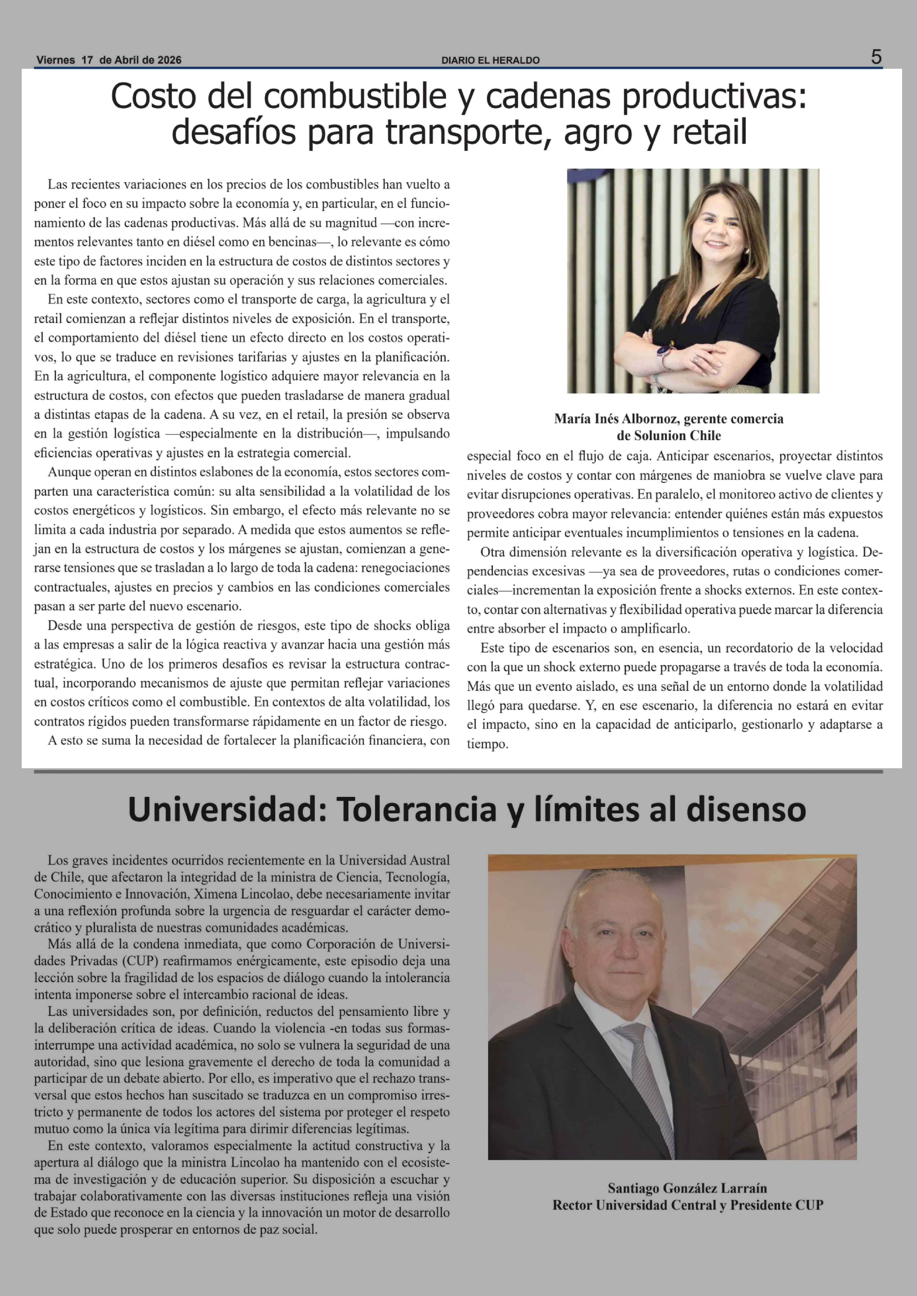 Columnas de Opinión: Costo del combustible y cadenas productivas: desafíos para transporte, agro y retail 17-04-2026 El Heraldo |