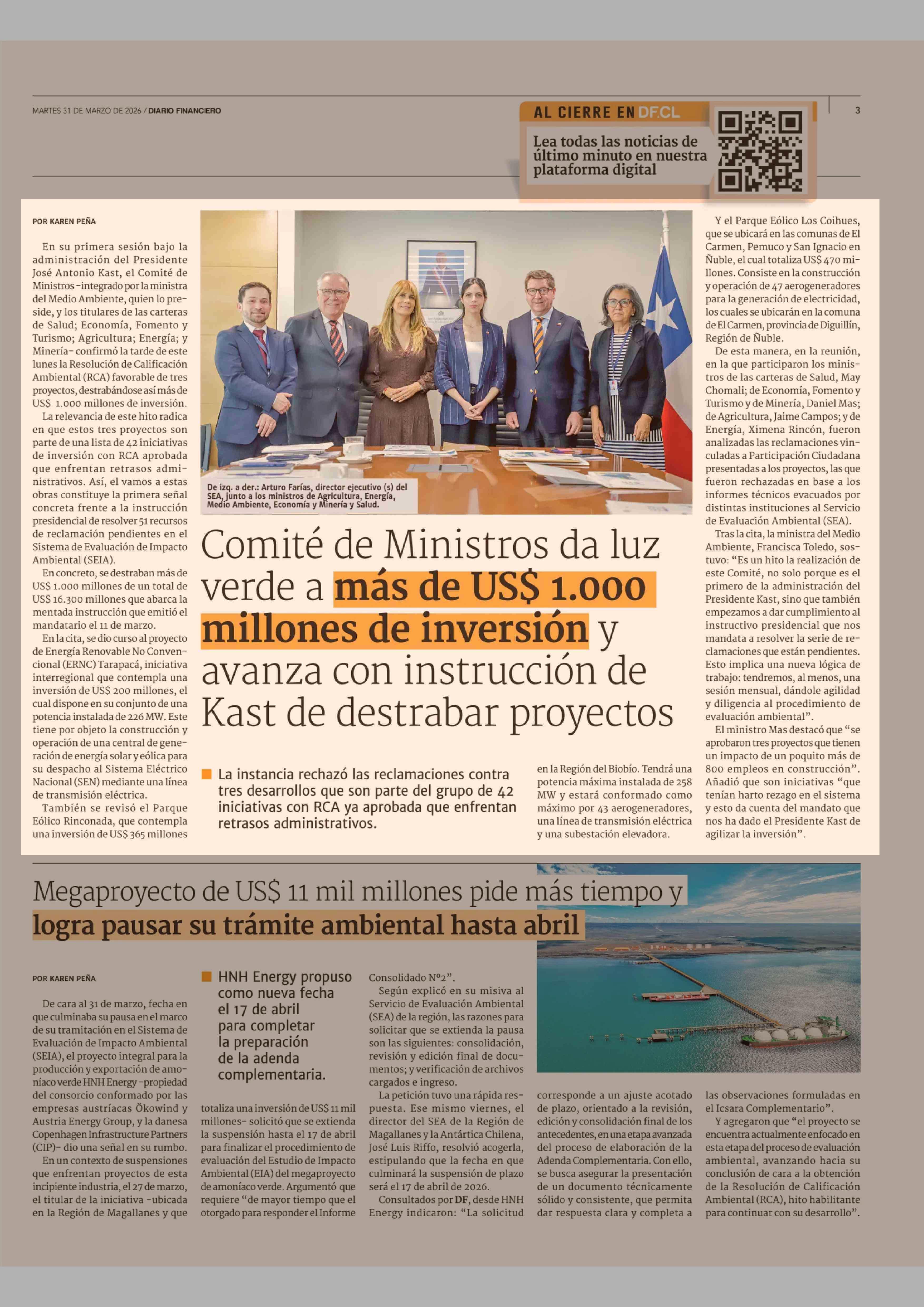 Comité de Ministros da luz verde a más de US$ 1.000 millones de inversión y avanza con instrucción de Kast de destrabar proyectos 31-03-2026 Diario Financiero |