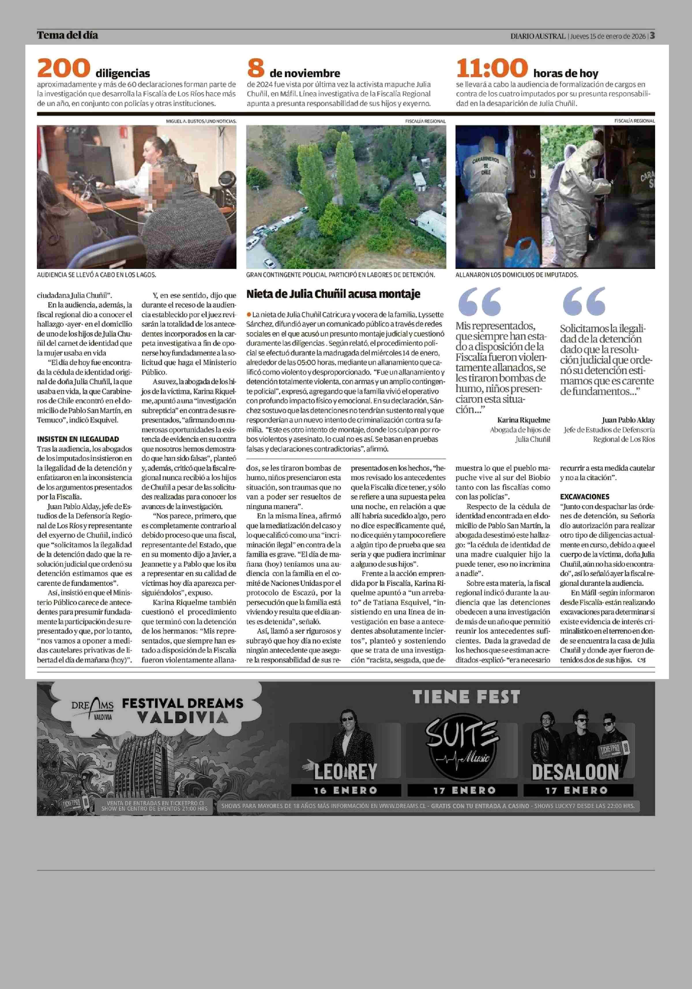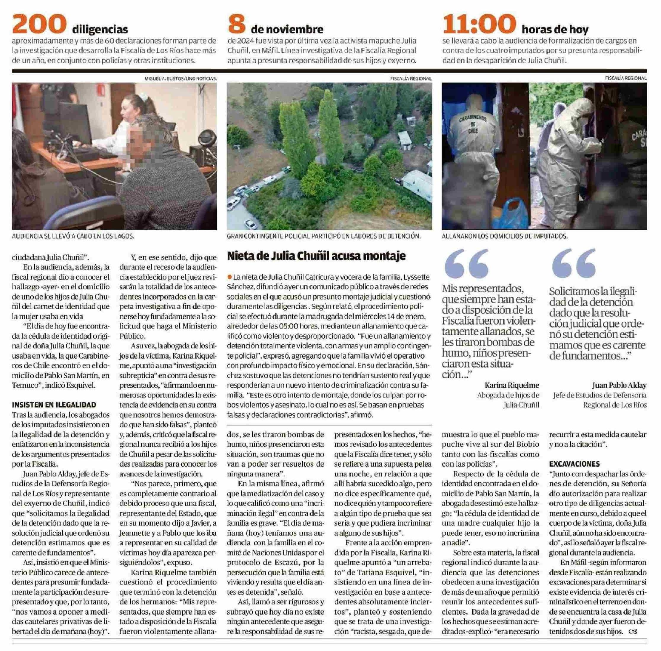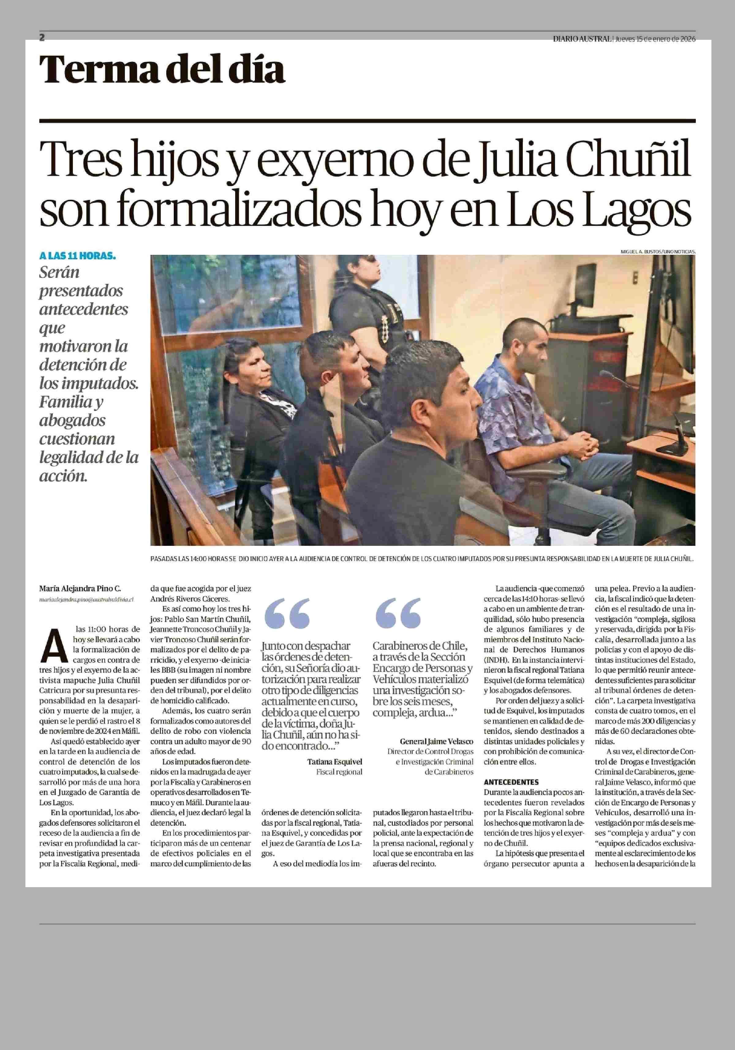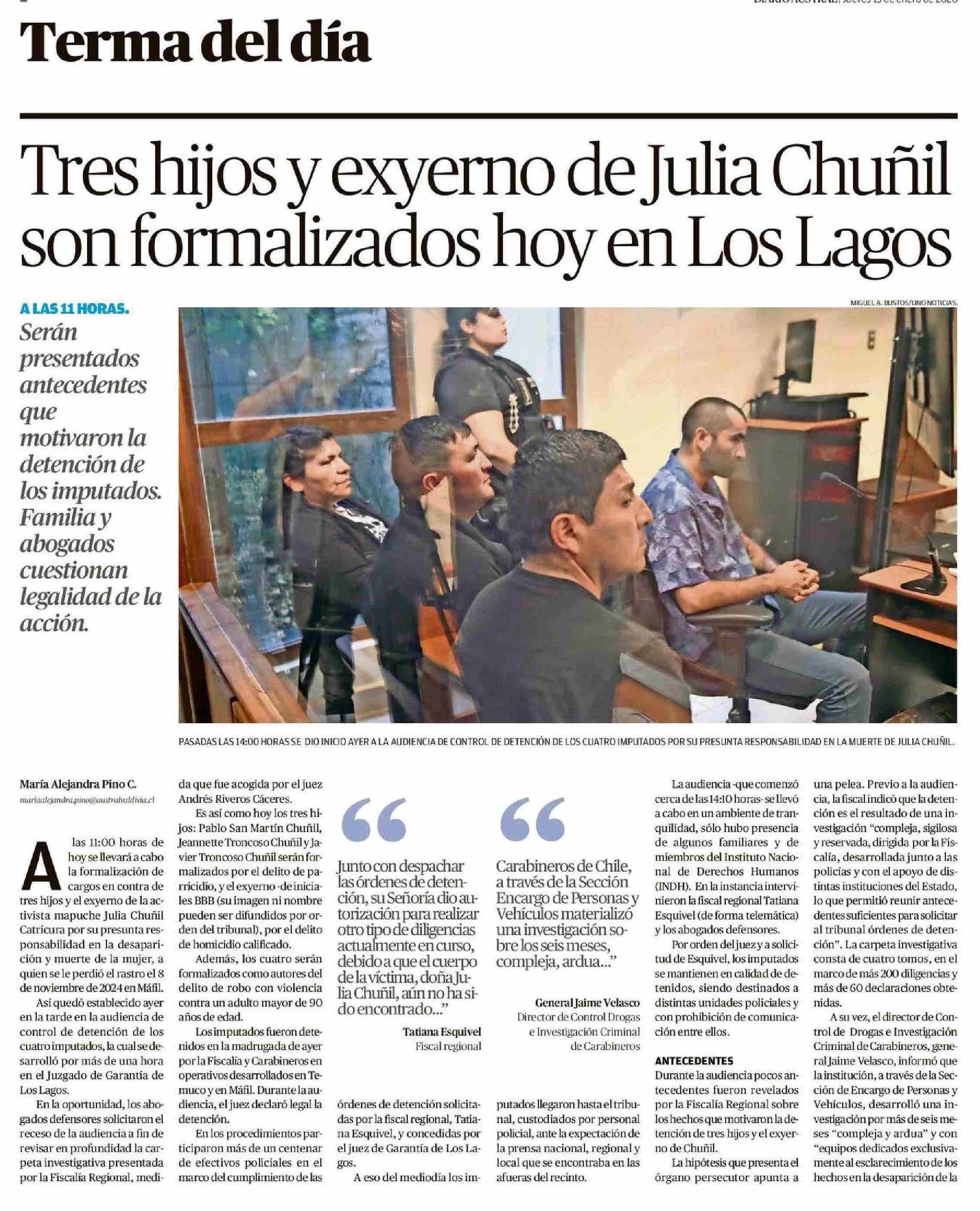 Tres hijos y exyerno de Julia Chuñil son formalizados hoy en Los Lagos 15-01-2026 Diario Austral Región de Los Ríos |