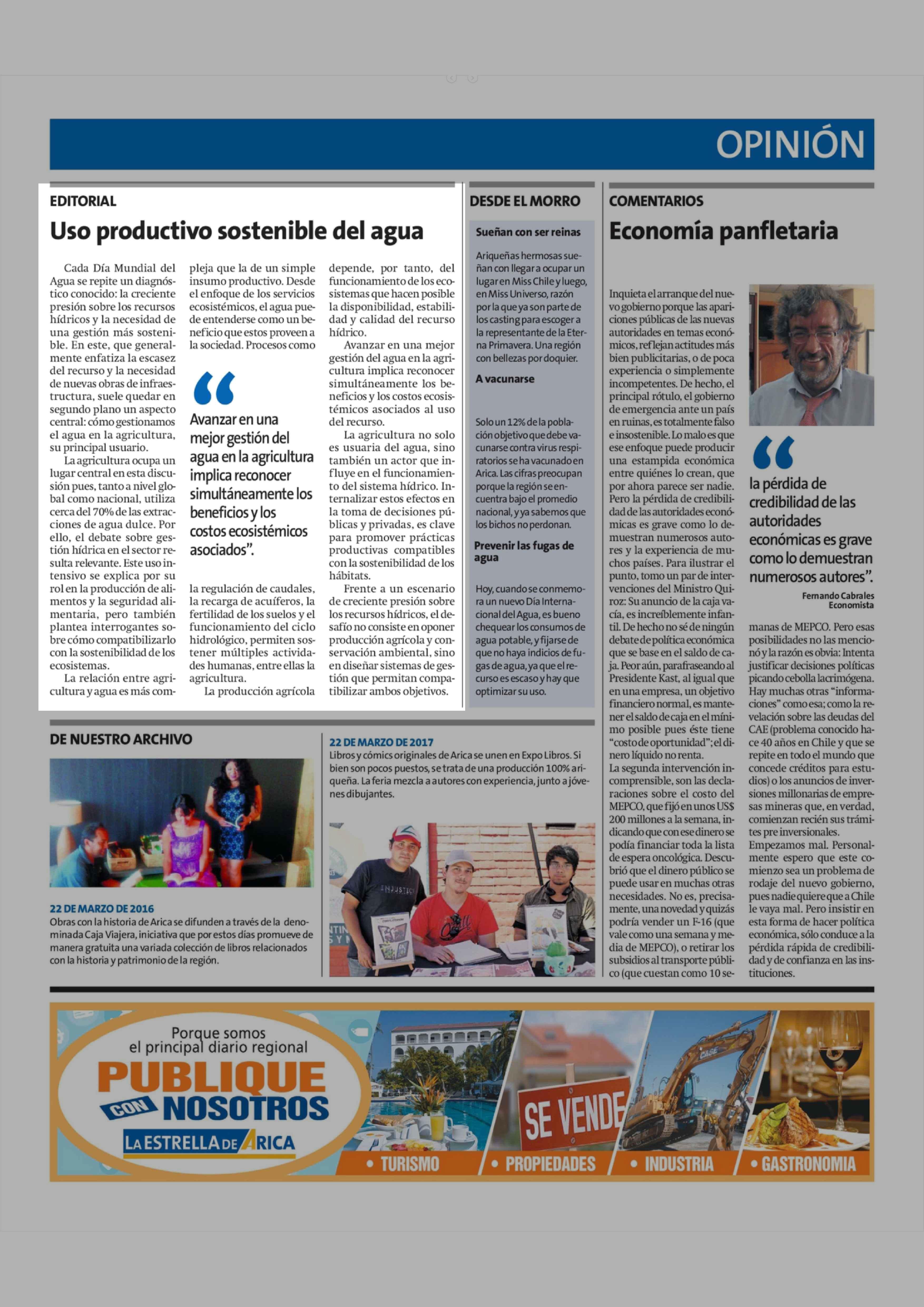 Editorial: Uso productivo sostenible del agua 22-03-2026 La Estrella de Arica |