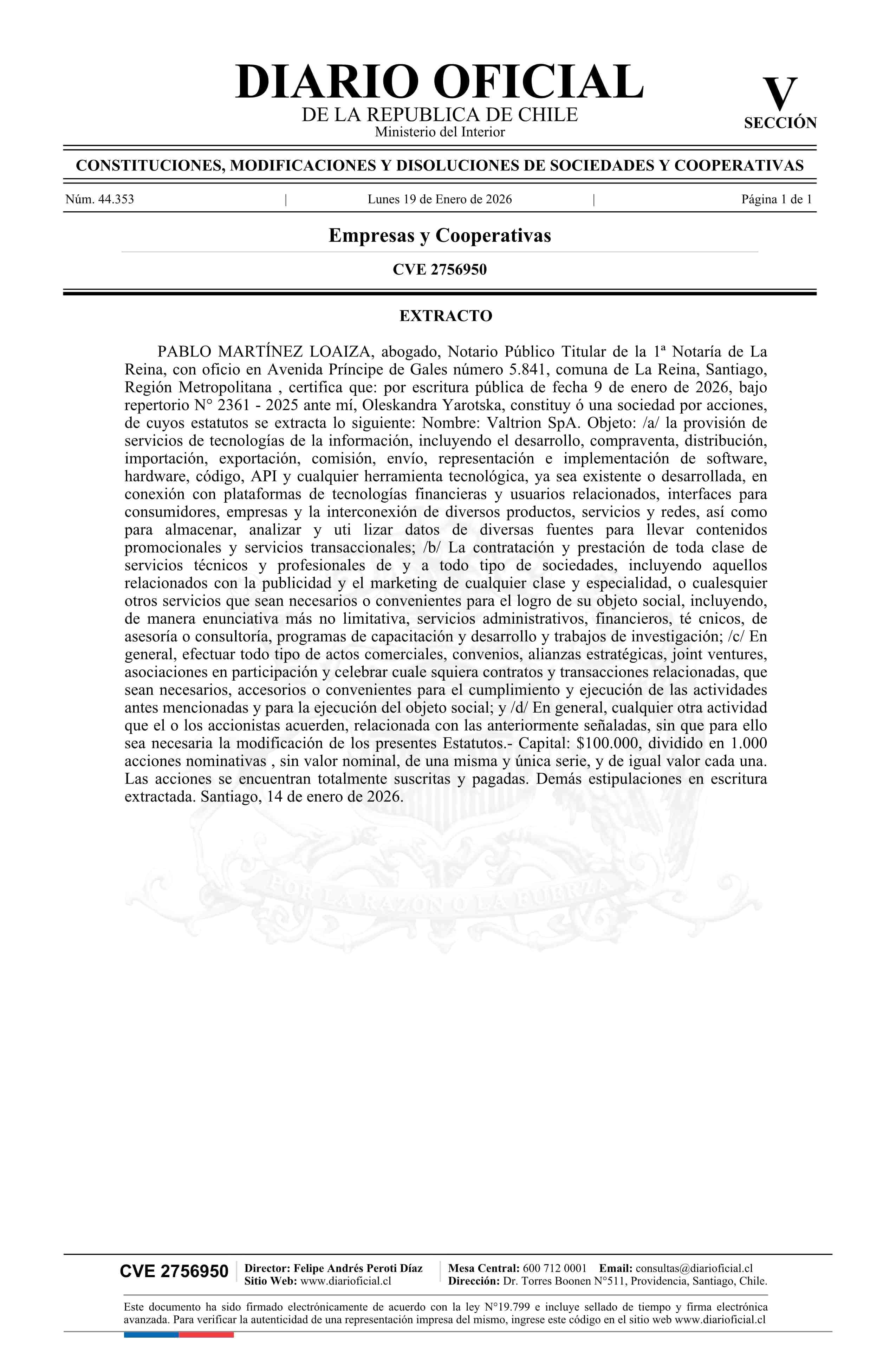Valtrion SpA 19-01-2026 Diario Oficial Edición Electrónica |